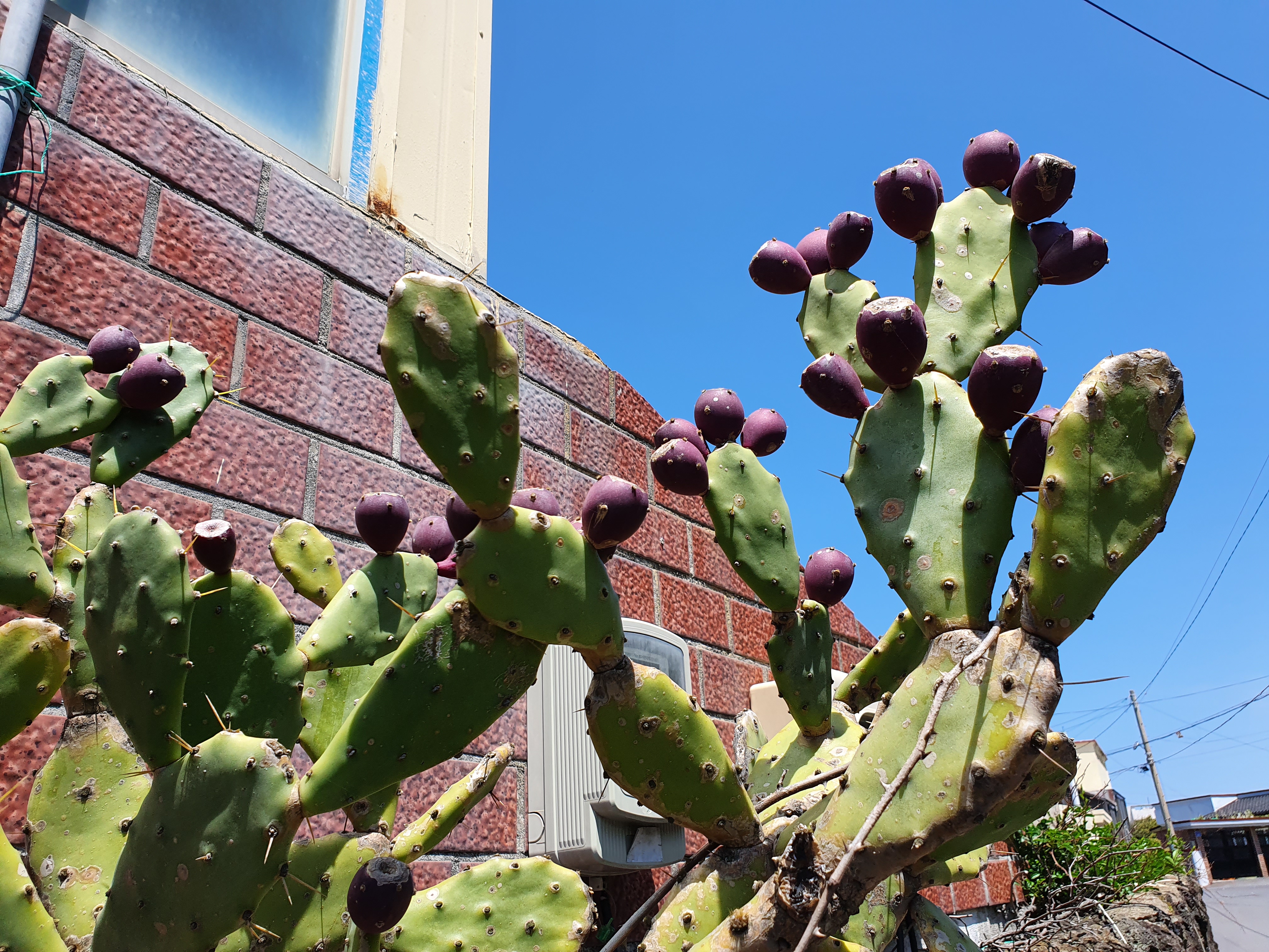 백년초입니다. 제주공항에서 기념품(?) 으로 사는 물건중에 백년초 초컬릿의 원료로 활용됩니다. 올레코스 이동중에 백년초를 주택 정원수로 재배하는 모습을 봤는데, 뭔가 일상적으로 볼 수 있는 풍경은 아닌 것 같네요.ㅎ