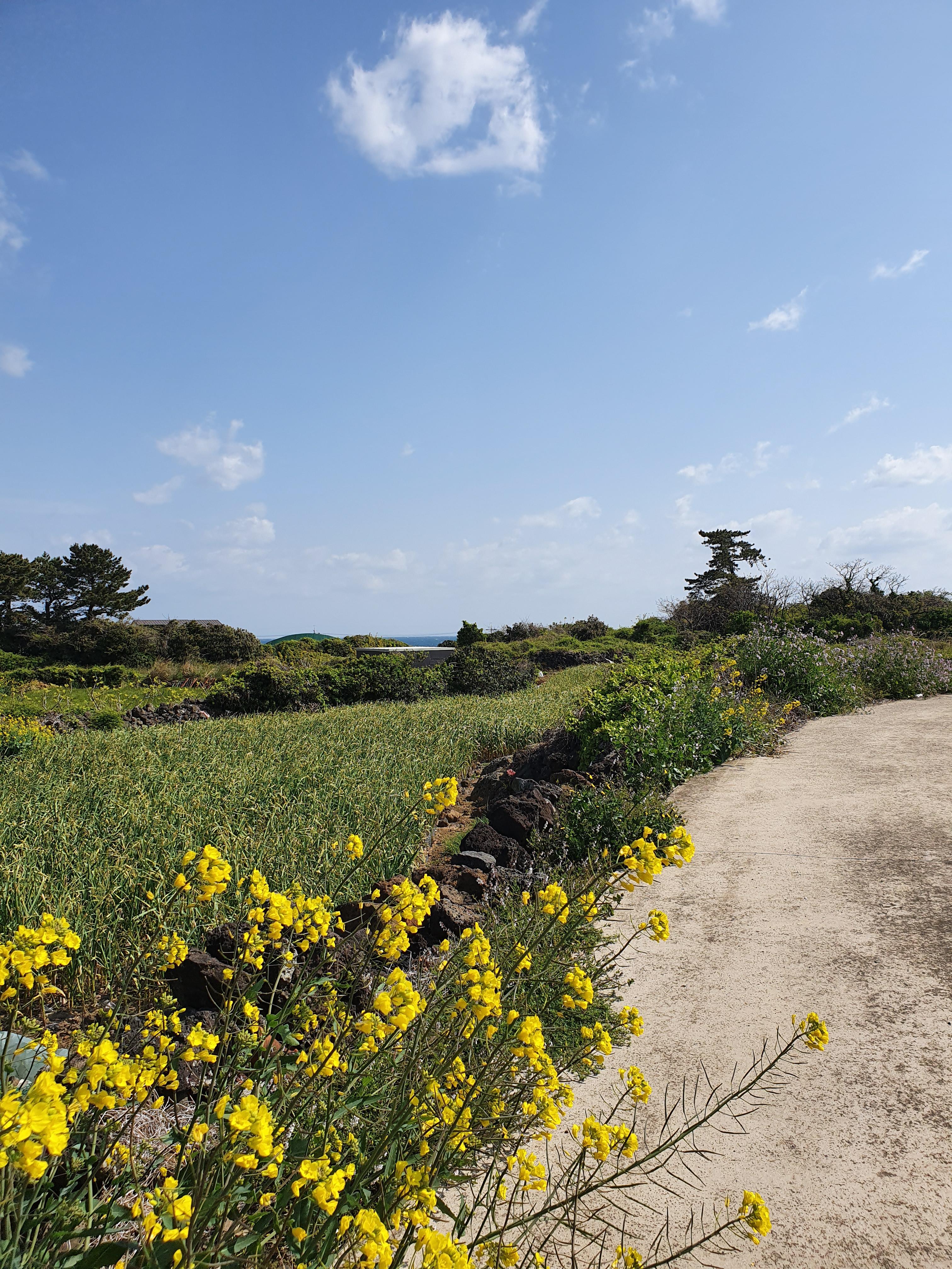 잠시 해안도로에서 마을 안쪽 길을 걸어가는데, 아직도 남아 있는 유채꽃이 눈길을 끕니다. 고요하고 평화롭기 그지없는 시골길이네요.