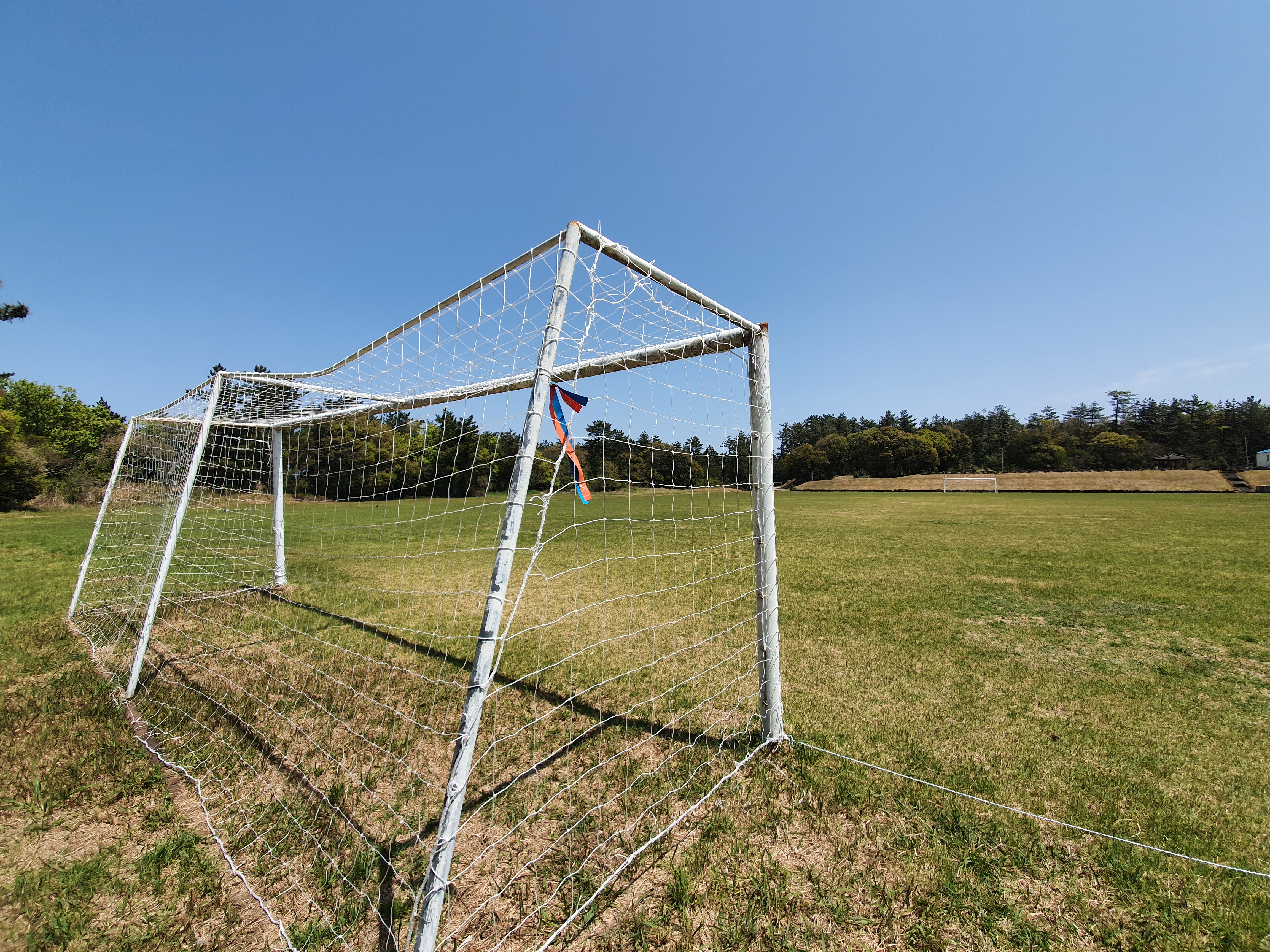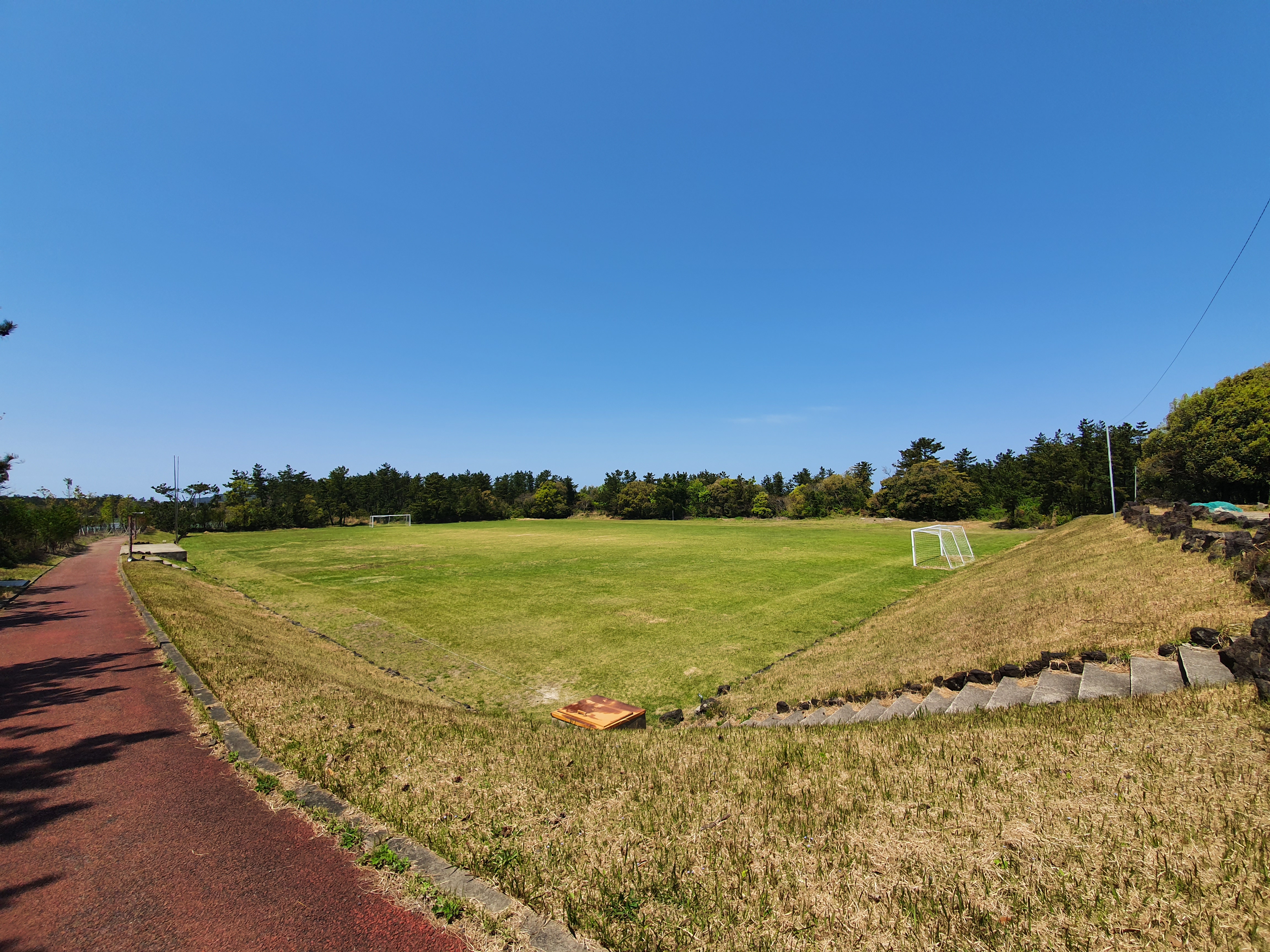 동복리 마을운동장은 잔디밭 축구경기장입니다. 골대 뒷편에 위치한 정자 방면으로 진행하면 이어지는 19코스 올레길을 확인할 수 있지요. 정자에서 잠시 앉아서 쉬어갑니다.