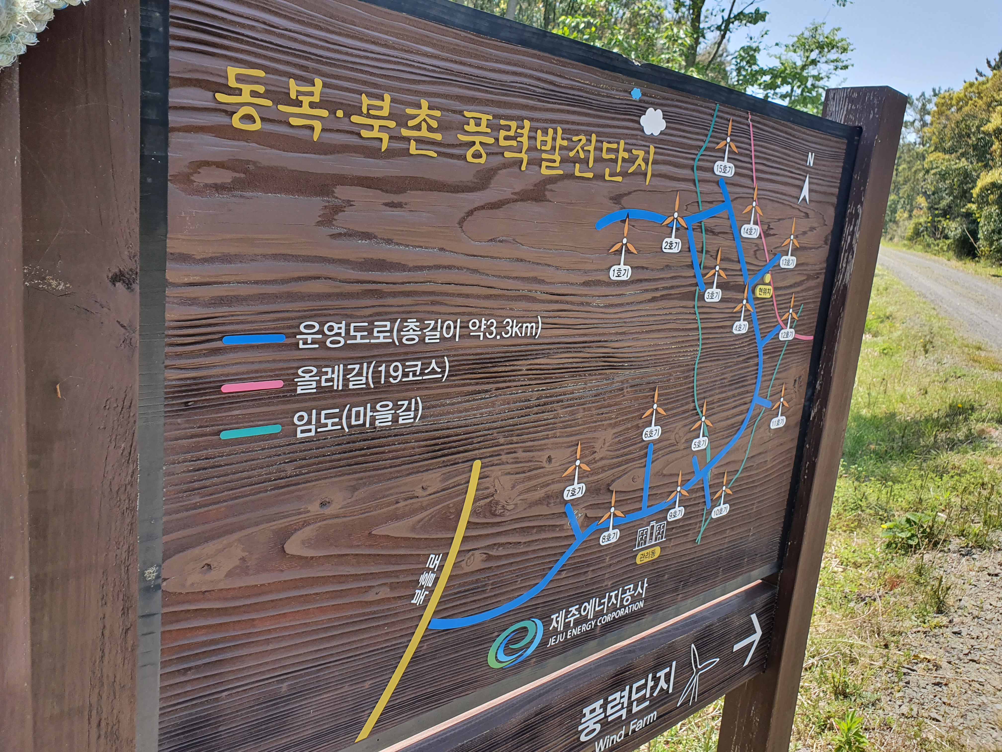 동복, 북촌 풍력단지로 들어서면 주변 공터에 총 15개의 웅장한 풍력발전기가 위치하고 있습니다. 이 주변을 모두 아울러 벌러진 동산이라고 부르는데, 계속 진행하다 2차선 포장도로로 내려서면 이제 김녕마을로 향하게 됩니다.