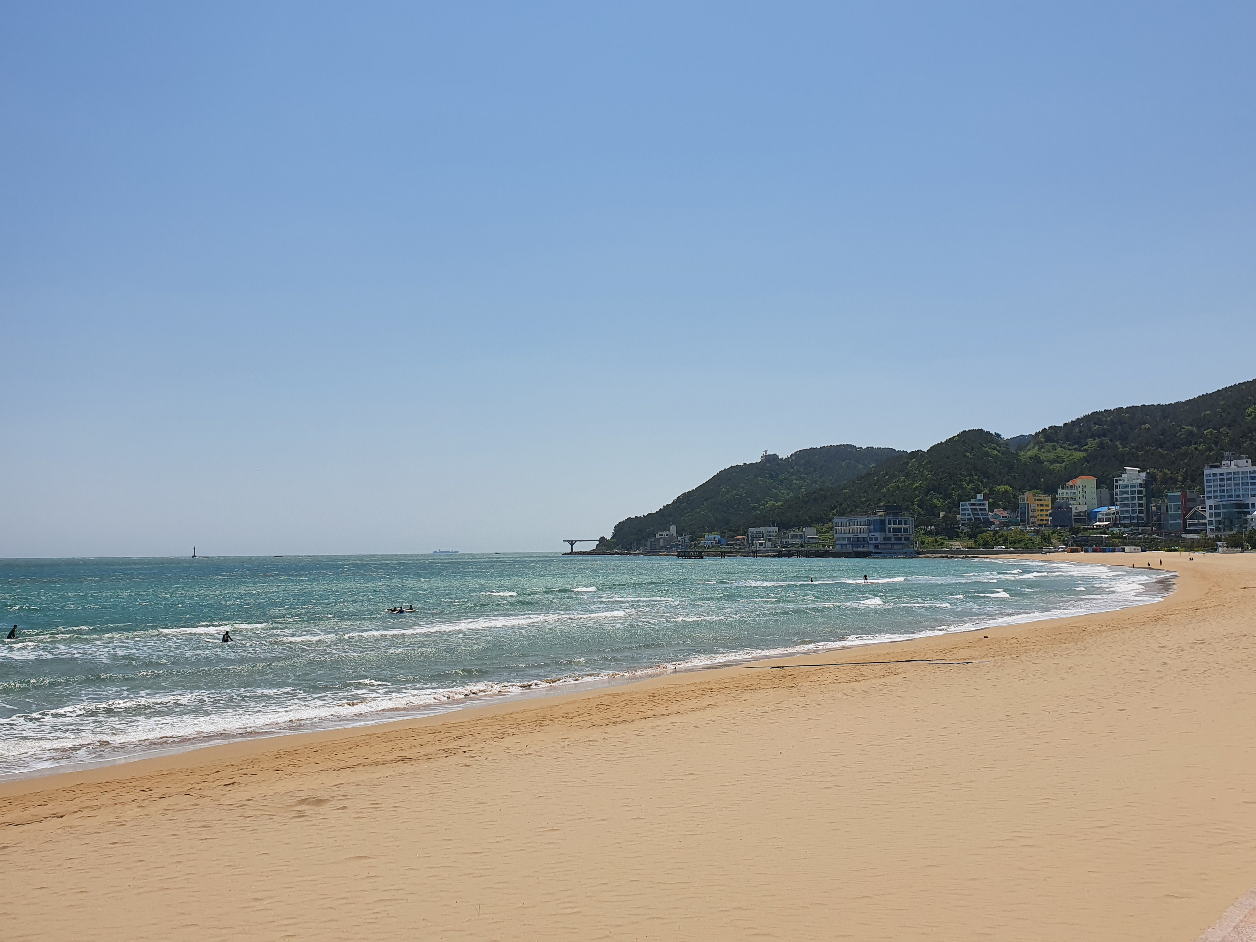전체길이 약 1.2km, 폭 57m 의 길고 넒은 백사장을 간직한 송정해수욕장은 수심이 얕고, 수질이 맑아 이미 언급한 바와 같이 가족여행지로서 아주 적합합니다. 사람이 없는 백사장이 다소 상당히 을씨년스럽게 느껴지네요.