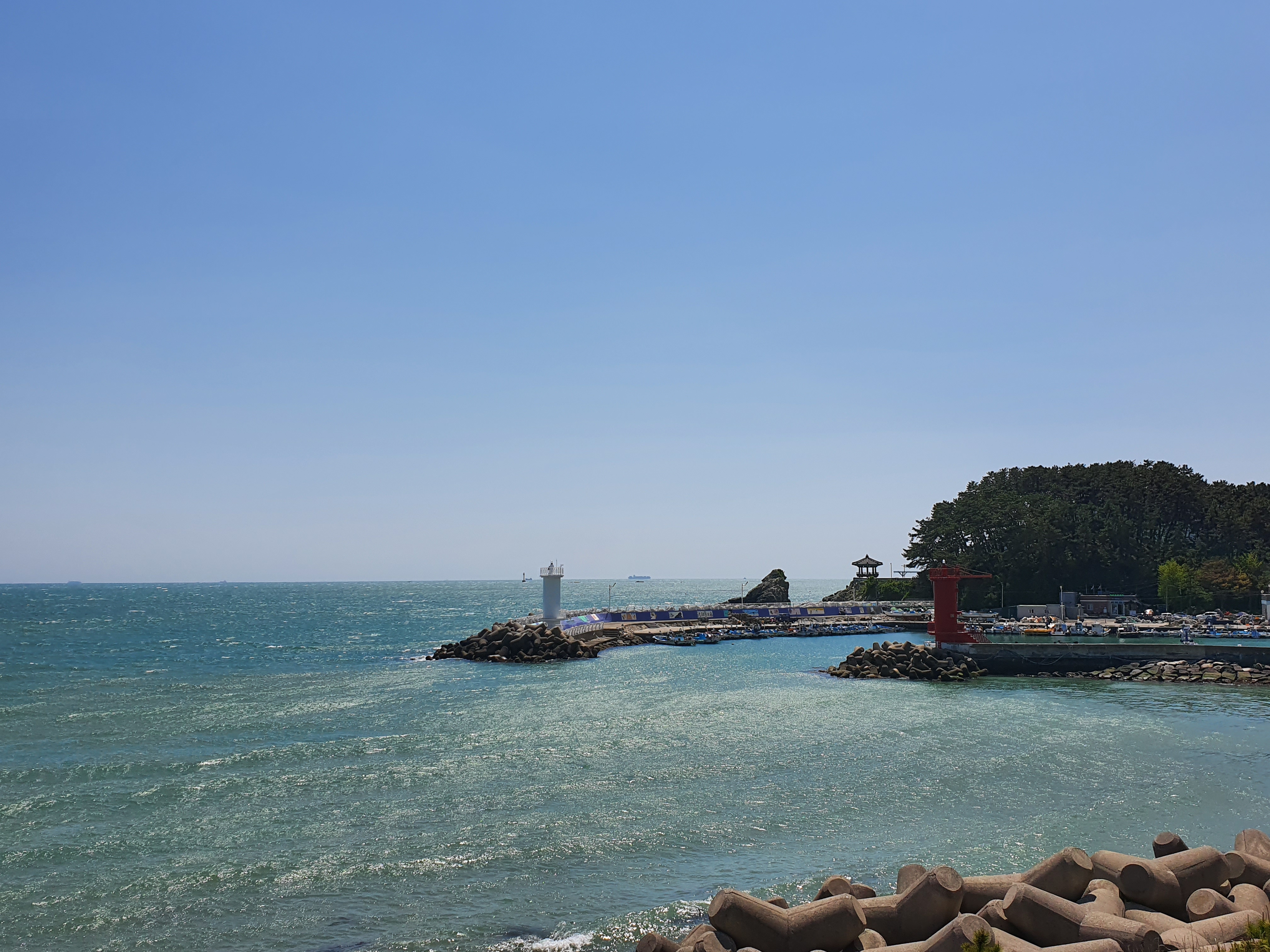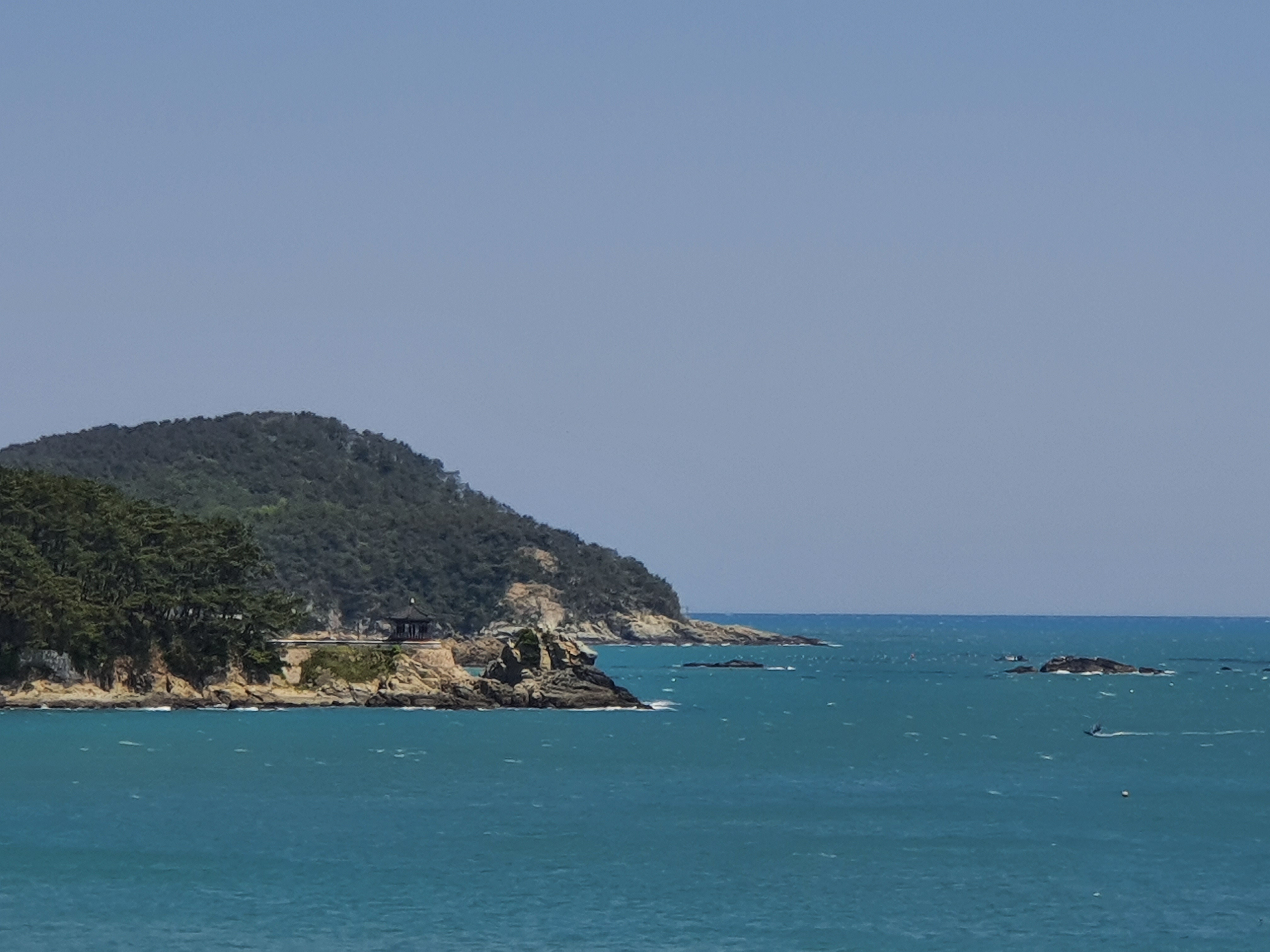 잠시후 만나게 될 송정해수욕장 끝에 위치한 죽도공원과 송일정 정자를 줌으로 당겨서 찍어 보았습니다. 오늘은 미세먼지가 그렇게 많지 않아 시계가 굉장히 좋은 것 같네요.