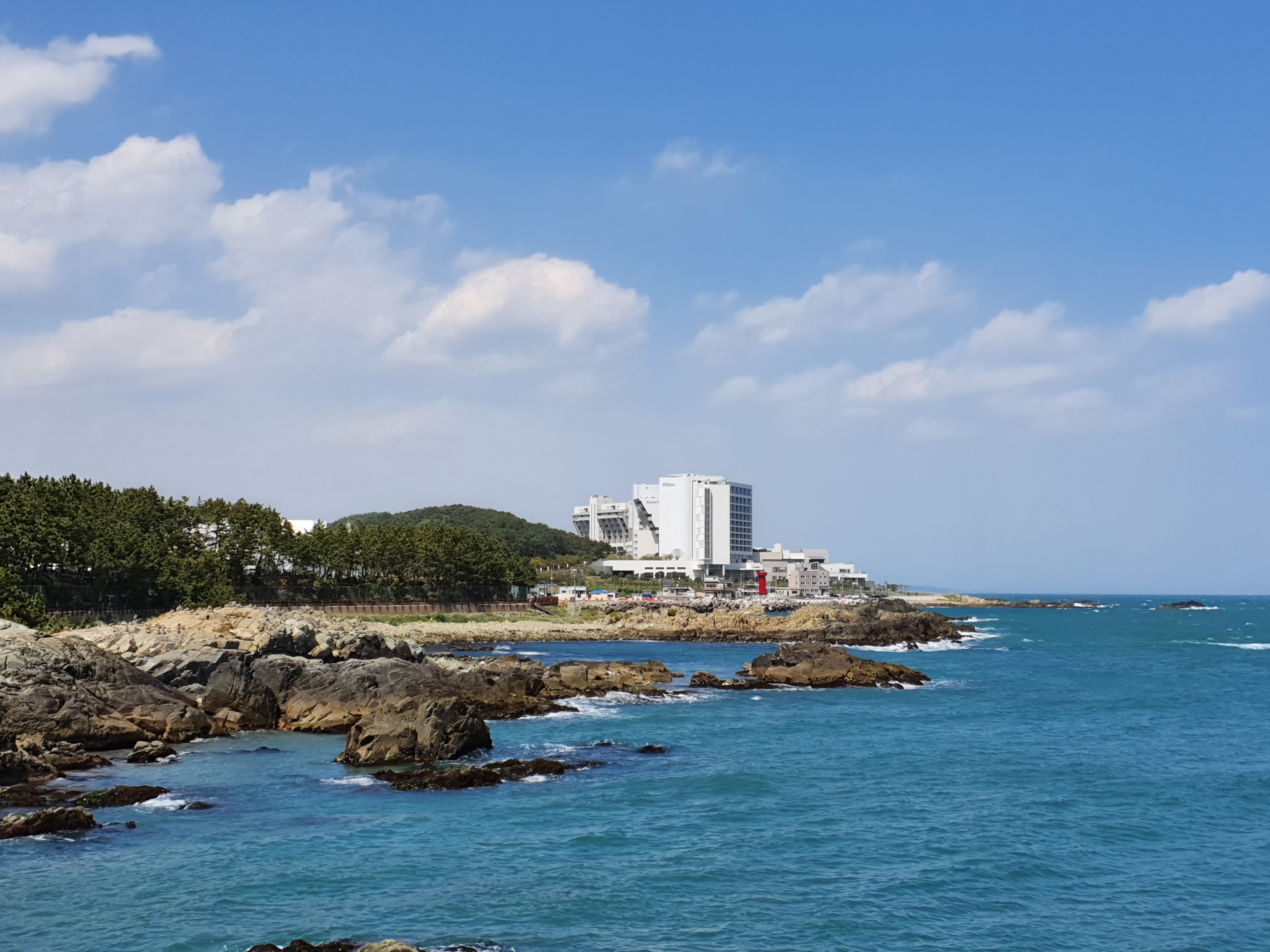 용궁사를 벗어나 해안길로 접어 들면서 다시 해안길을 따라서 걷게 됩니다. 솜털 같은 구름이 떠 다니는 해안아래 보이는 하얀색 건물이 바로 부산 힐튼호텔(아난티코브) 이지요.