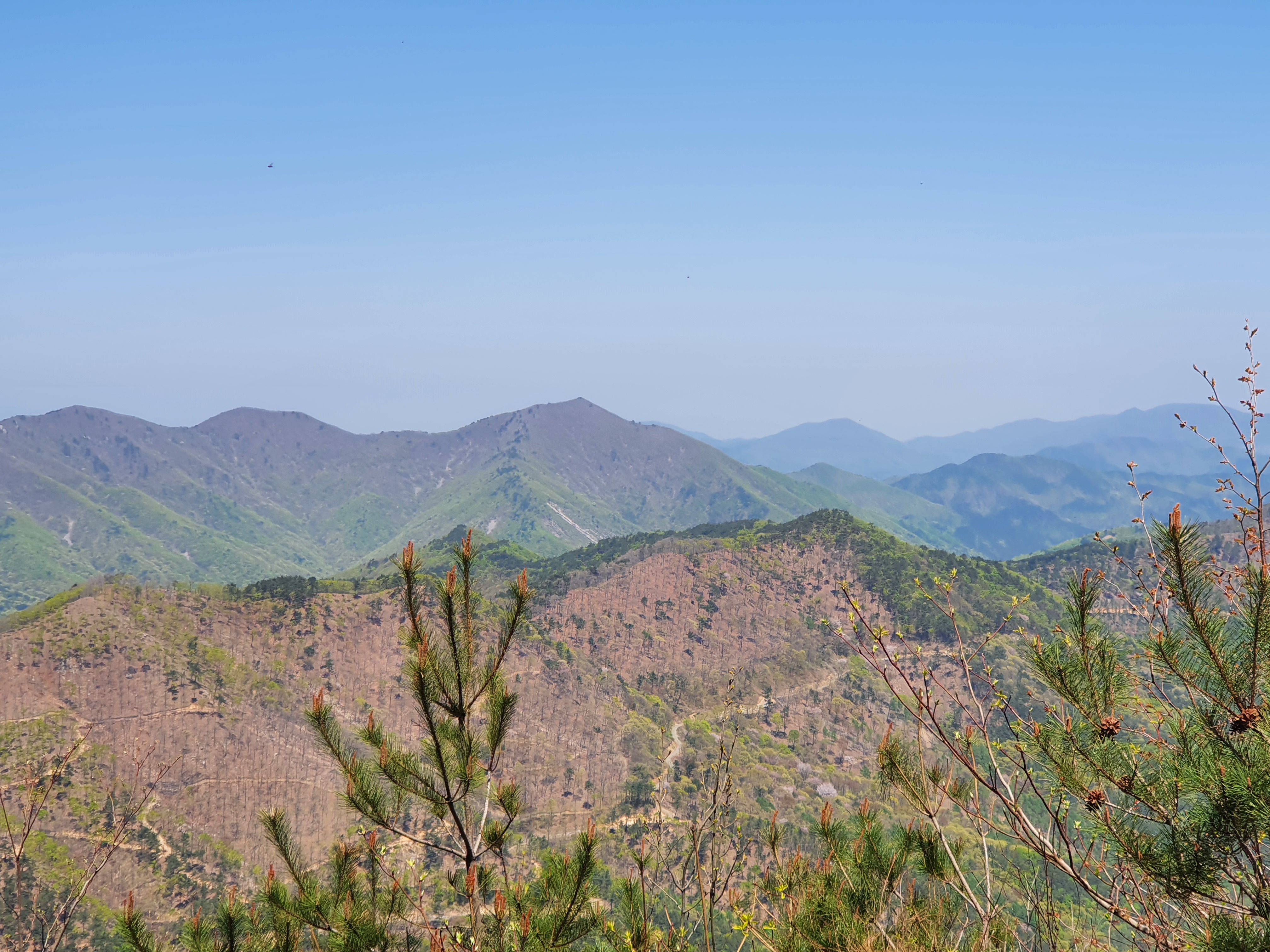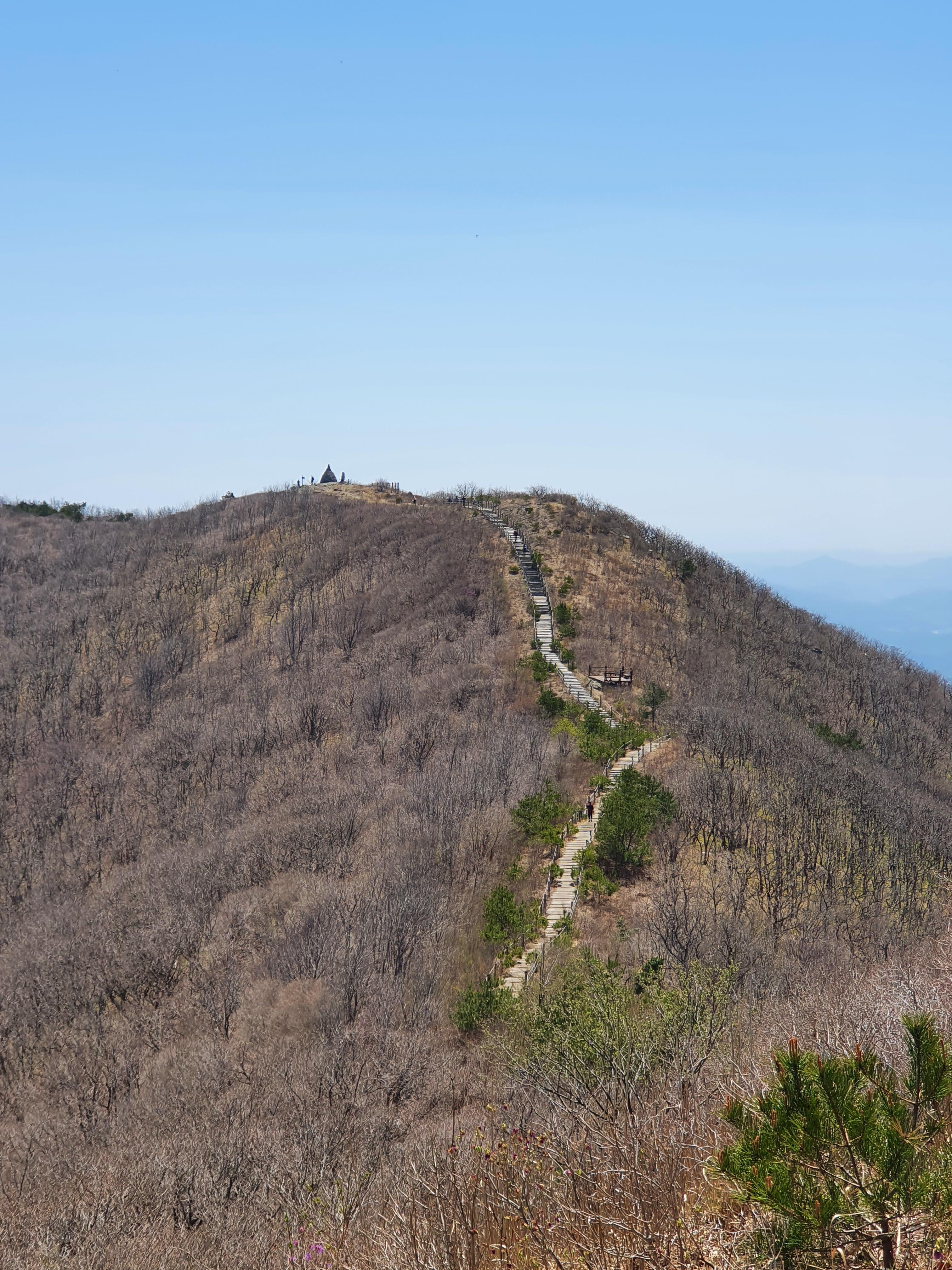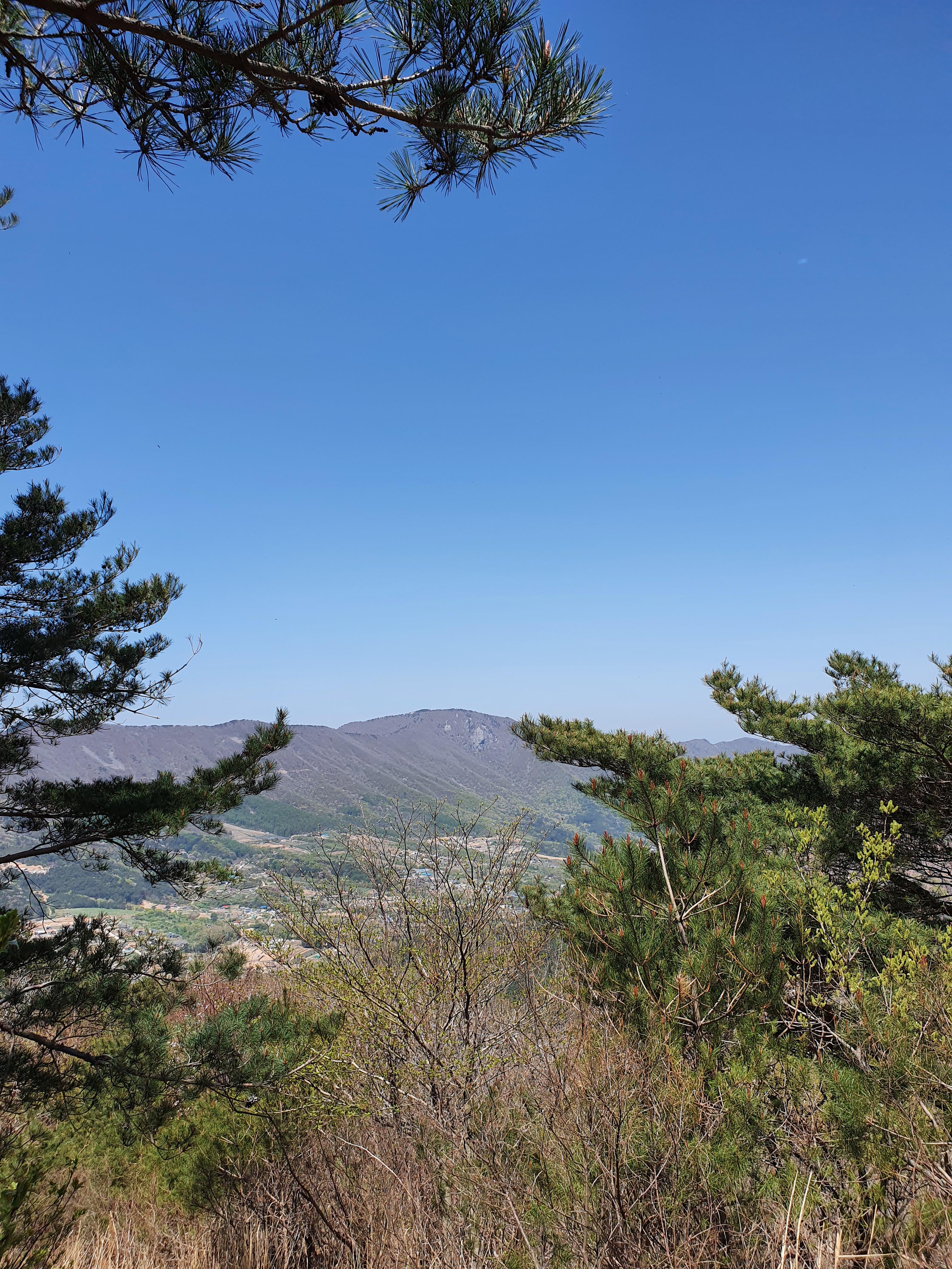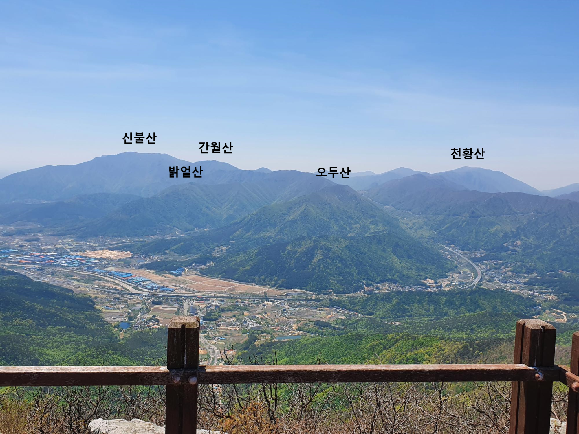 해발고도가 조금 더 높아지자, 이제 문복산 쪽 조망이 더욱 또렷해 졌습니다. 북쪽으로 길게 병풍처럼 산이 늘어서 있고 아랫쪽으로는 소호리와 동창천이 흐르는 대현리 마을입니다. 그리고, 대현리를 가운데로 가로지르는 921번 지방도를 따라 가면 단석산이 나오지요.