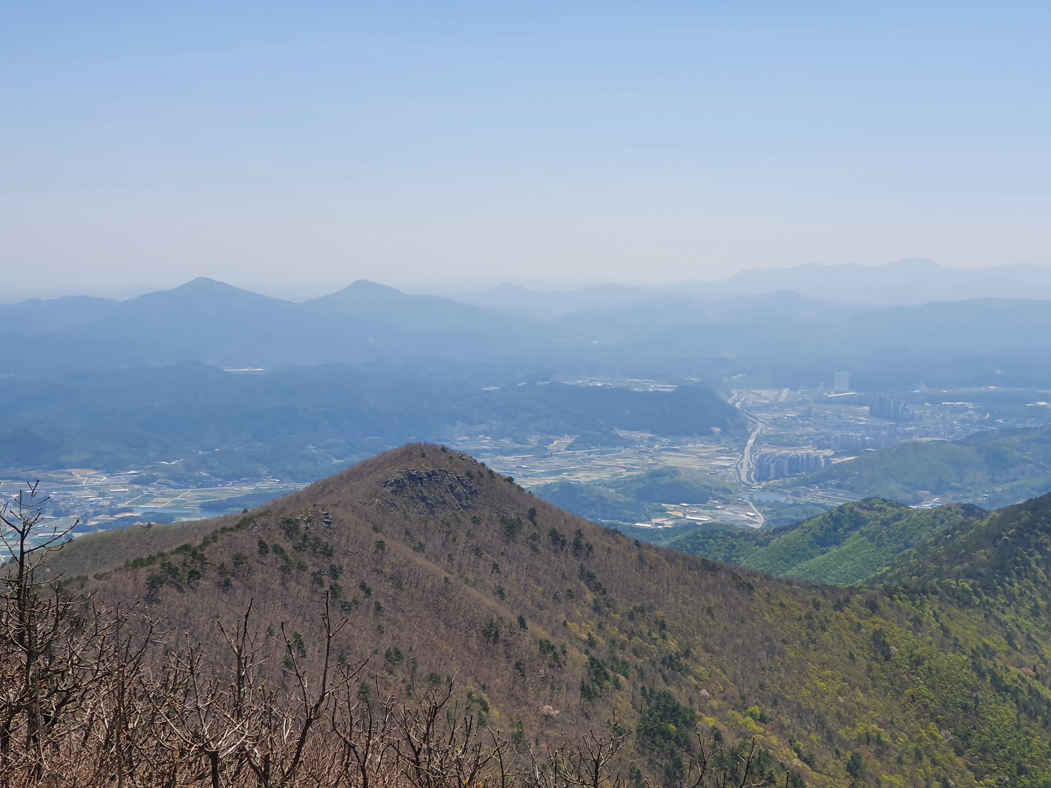 고헌산 정상 바로 아랫쪽에는 고운산이, 그리고 아랫쪽은 언양읍, 저 멀리 울산 방향에서 쌍둥이처럼 솟은 봉우리 왼쪽이 문수산(600m), 오른쪽이 남암산(544m) 입니다.