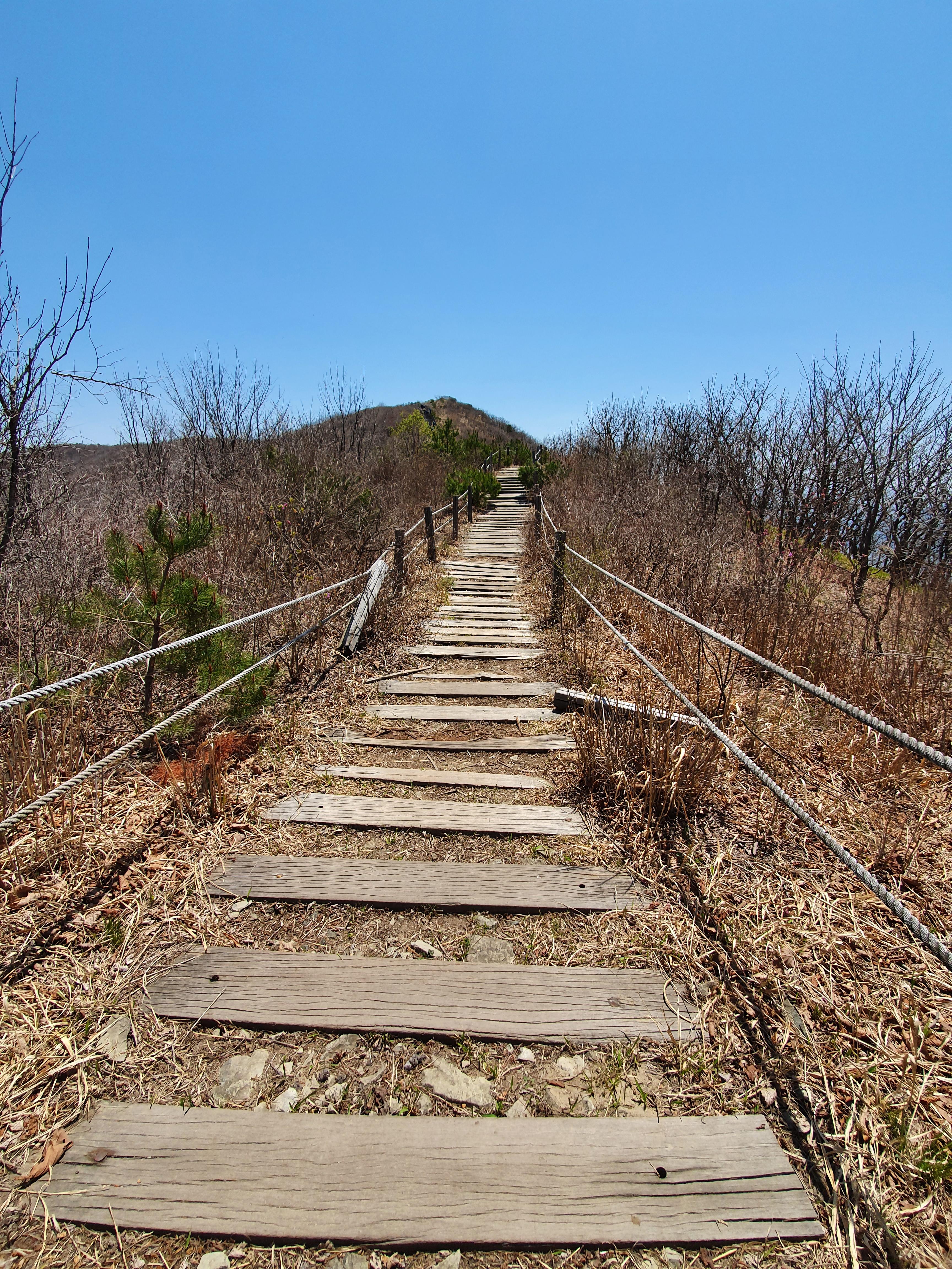 서봉에서 내려와 고헌산 정상 방면으로 오래되었지만 아주 고풍스러운 데크길을 따라 걸어갑니다. 데크길 오른쪽 쉼터, 바로 이 곳에서 저의 백패킹 첫날밤(?) 이 있었더랬죠. 데크 일부는 너무 낡아서 손을 좀 본 것 같습니다.