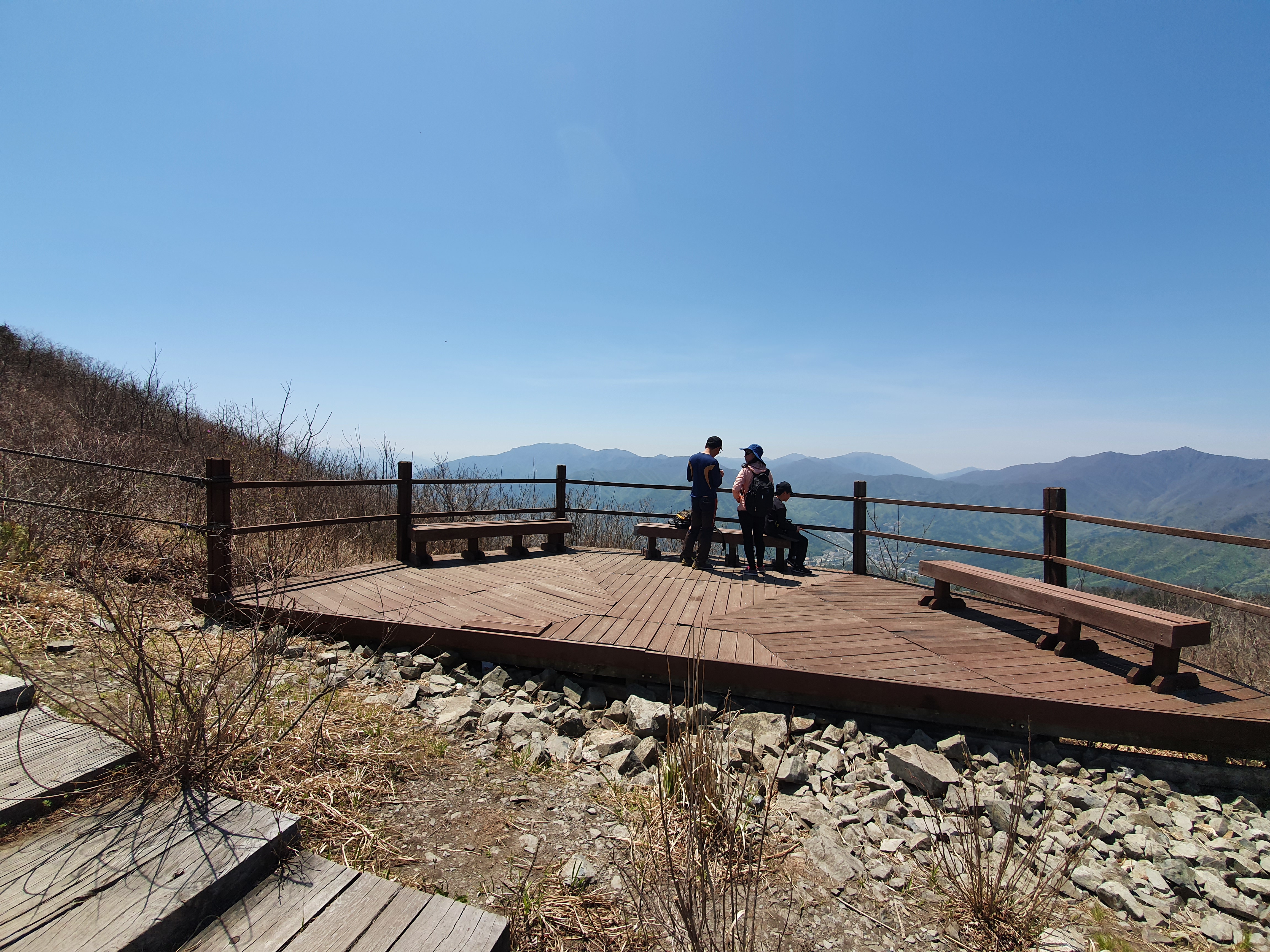 드디어 뒷 편으로 조망이 트이면서 청도군에 위치한 문복산(1,013m) 를 볼 수 있습니다. 영남알프스 소속 산군을 9개산까지 확장하면 문복산(文福山) 까지를 제일 막내로 쳐줍니다.