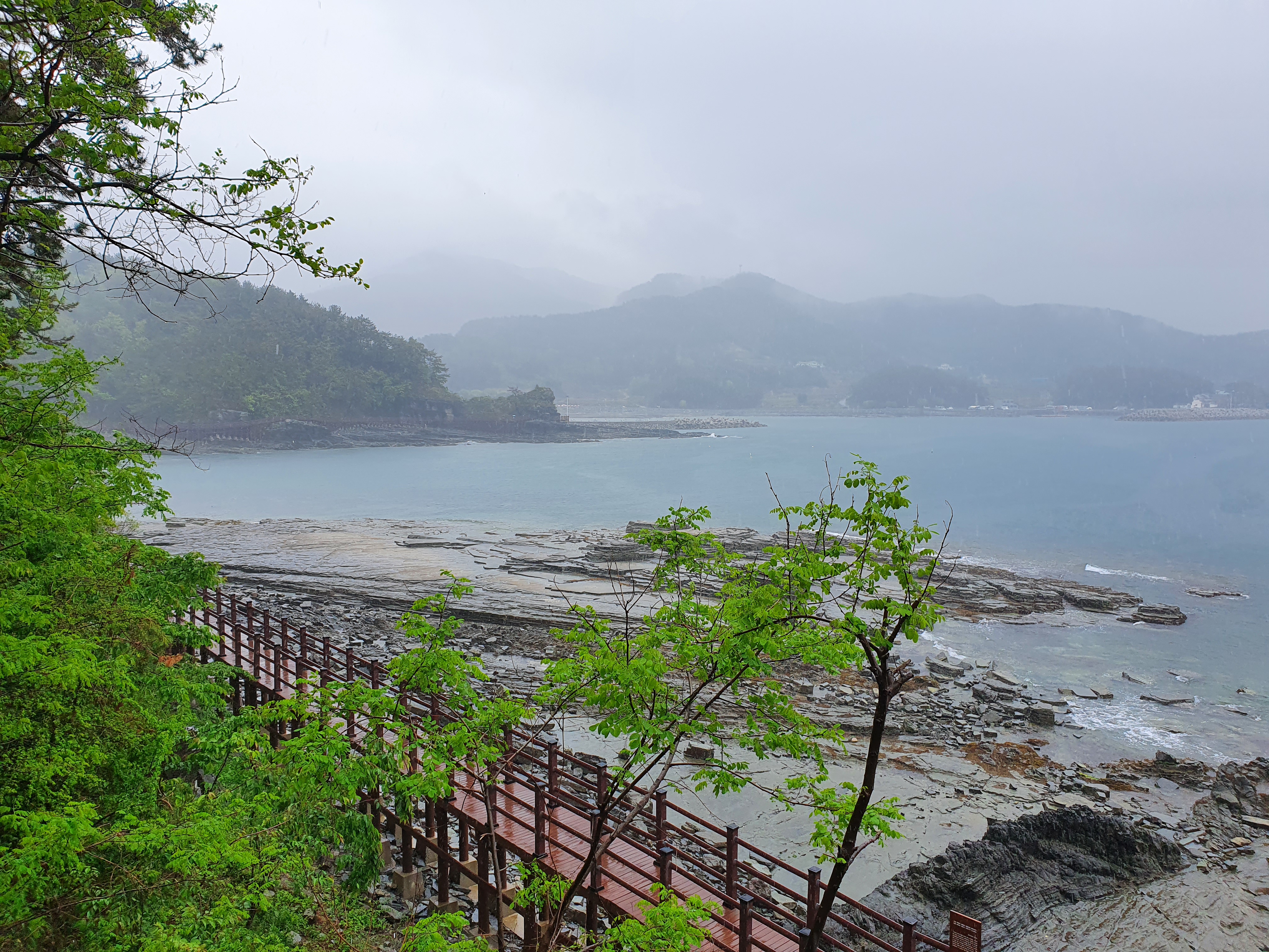 비가 내리다보니, 바다의 색감이 글루미 코발트(Gloomy Cobalt) 인데, 나름대로의 분위기가 있습니다. 상족암 초입, 편의점 근처에 차를 세워두고 약 500m 정도의 데크길을 따라 걸어 들어가야 하죠.