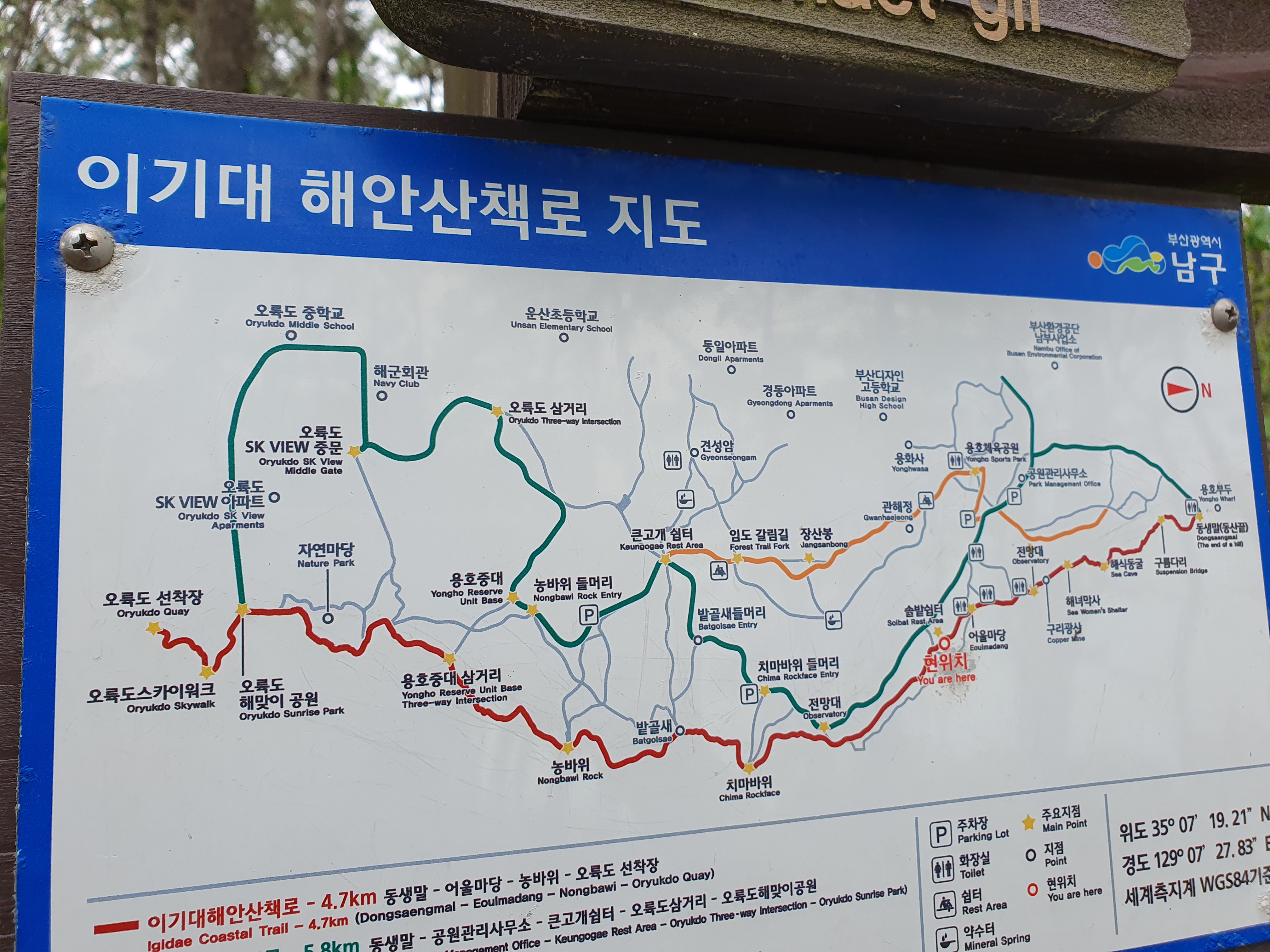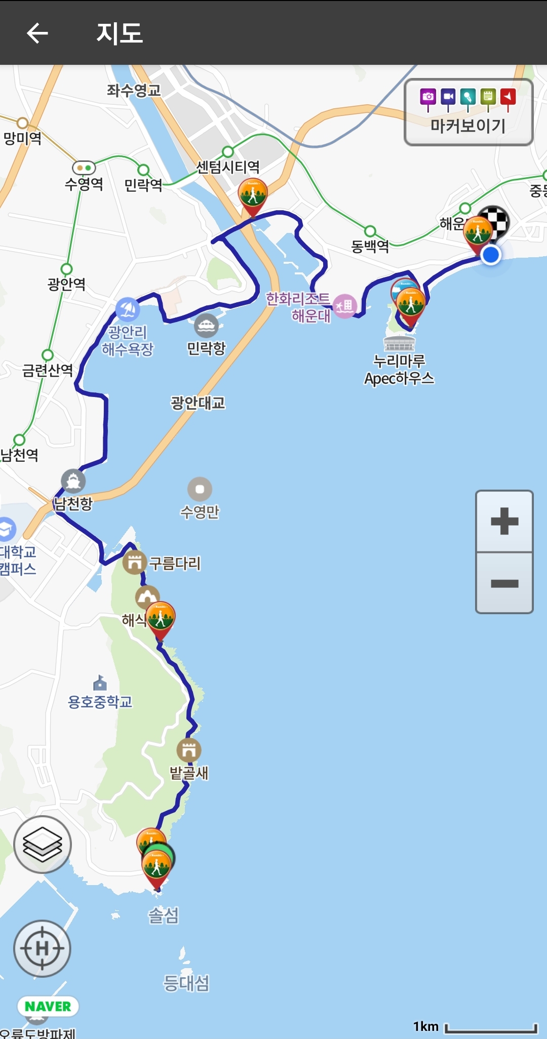 이동경로중 큰 포인트로만 짚어보자면, 제일 아랫쪽 오륙도 해맞이 공원을 시작으로, 농바위~동생말~광안리 해변~민락 수변공원~부산 요트경기장~동백섬~APEC 하우스~해운대 해수욕장~미포에 도착하면 1구간이 완성됩니다.