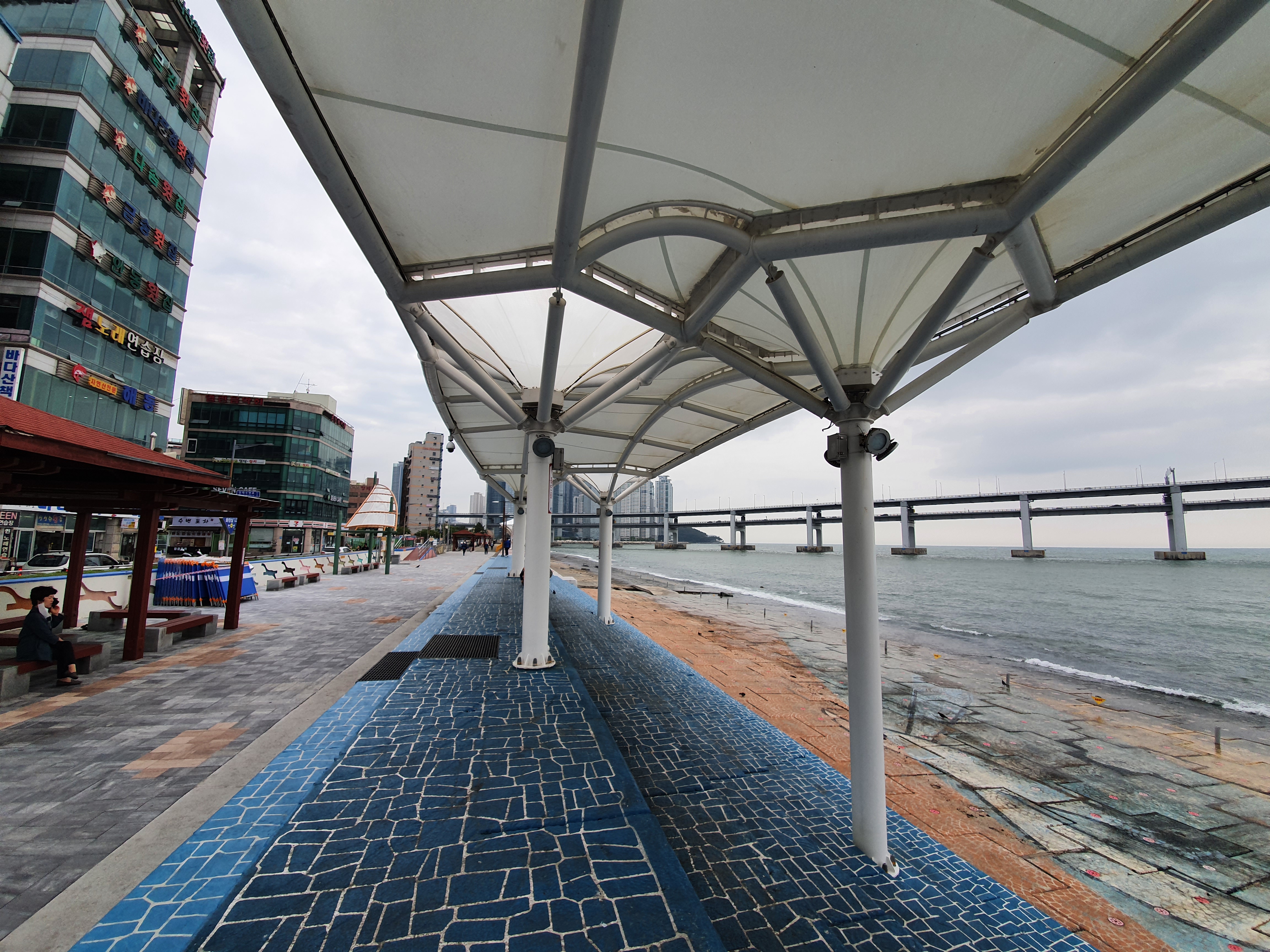 민락 수변공원입니다. 뒷편의 회센터에서 회를 사서 여기서 드시는 분들이 꽤 되는데, 항구 특유의 짠내와 근처를 날아다니는 독수리 크기(?) 의 갈매기들 때문에 생각보다는 그닥 낭만적이지는 않답니다ㅎ