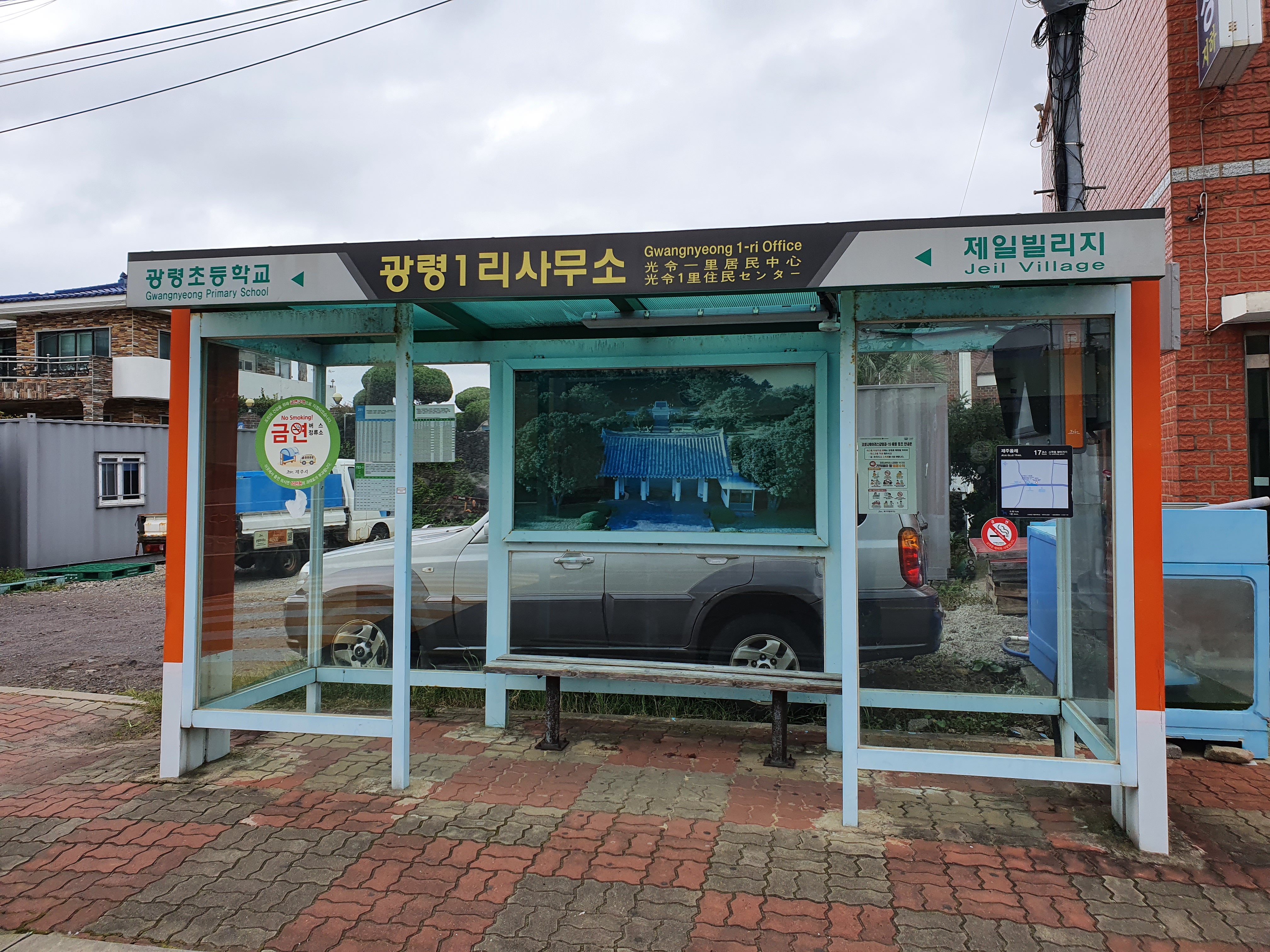 차창 밖 풍경을 멍하니 바라보고 있었는데, 너무나도 정확하게도 31분만에 광령1리 사무소 정류장에 도착했네요. 시내에서 벗어나다보니 한적합니다.