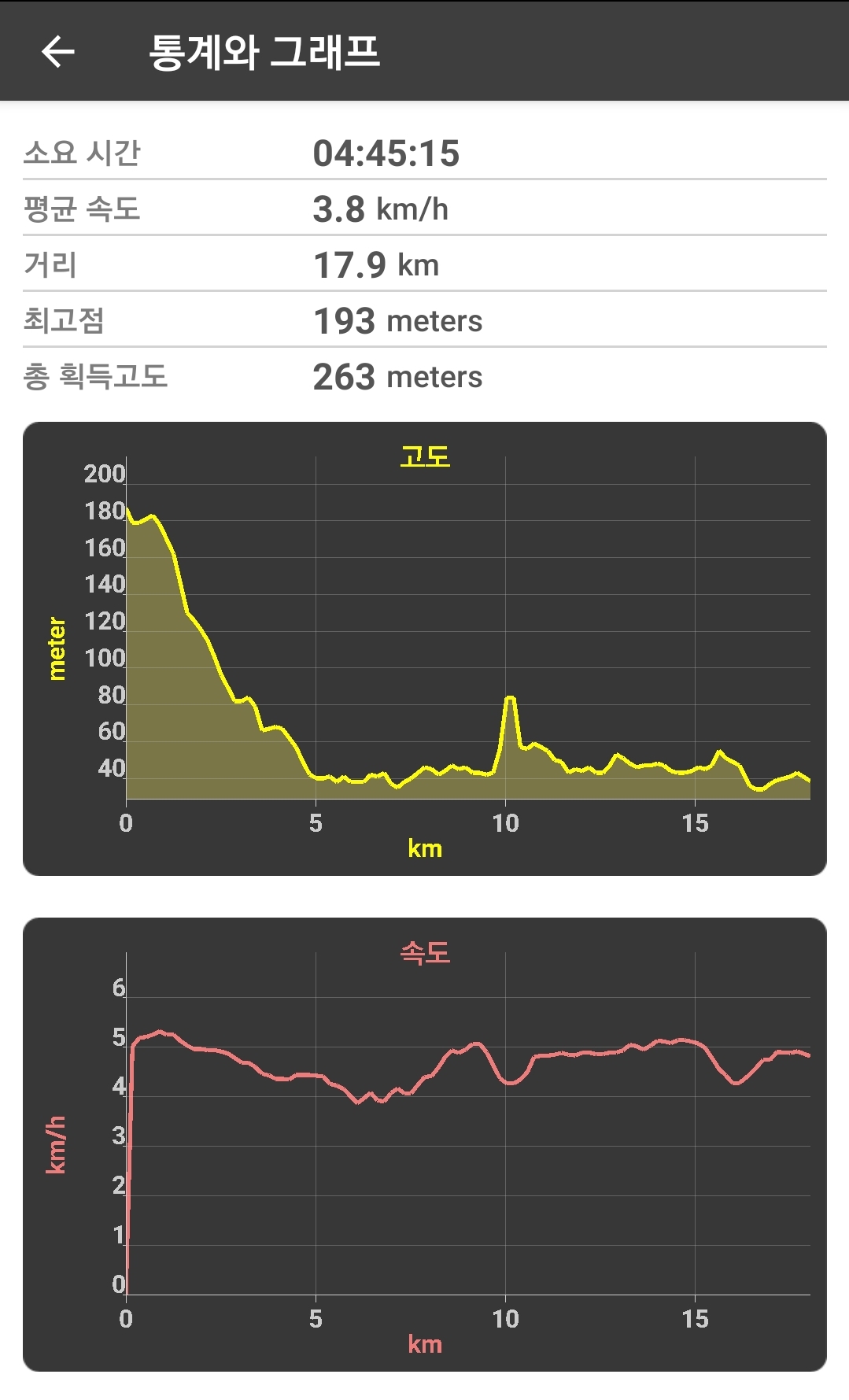 17코스는 총 18.1km 정도의 거리로서, 고도표에서 볼 수 있는 것처럼 아랫쪽으로 내려가는 구조라서 상당히 쉬운 편입니다. 저는 약 4시간 45분이 걸렸네요.