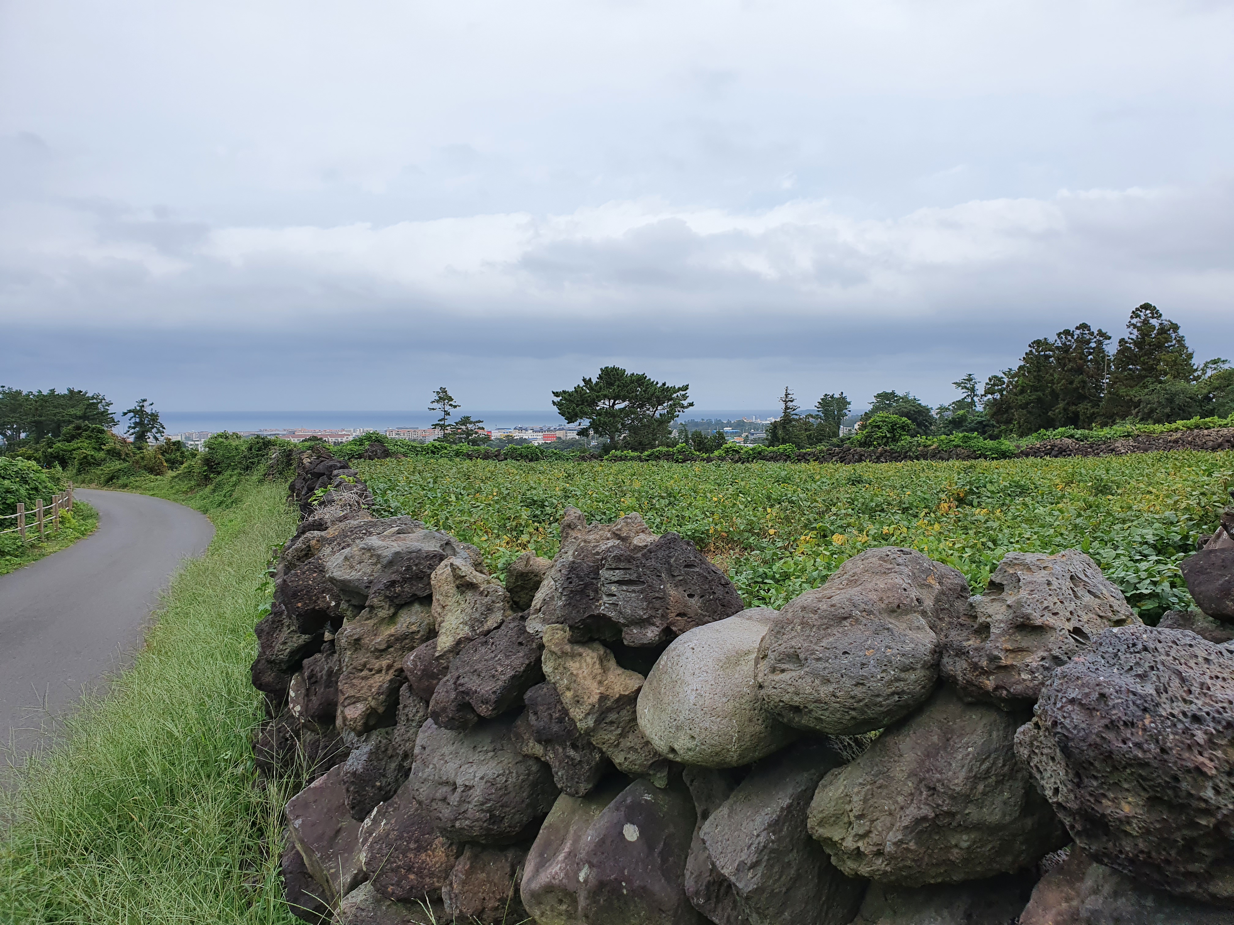제주의 감성을 가득 담은 돌담길 너머 아랫편으로 바다가 보이는군요.