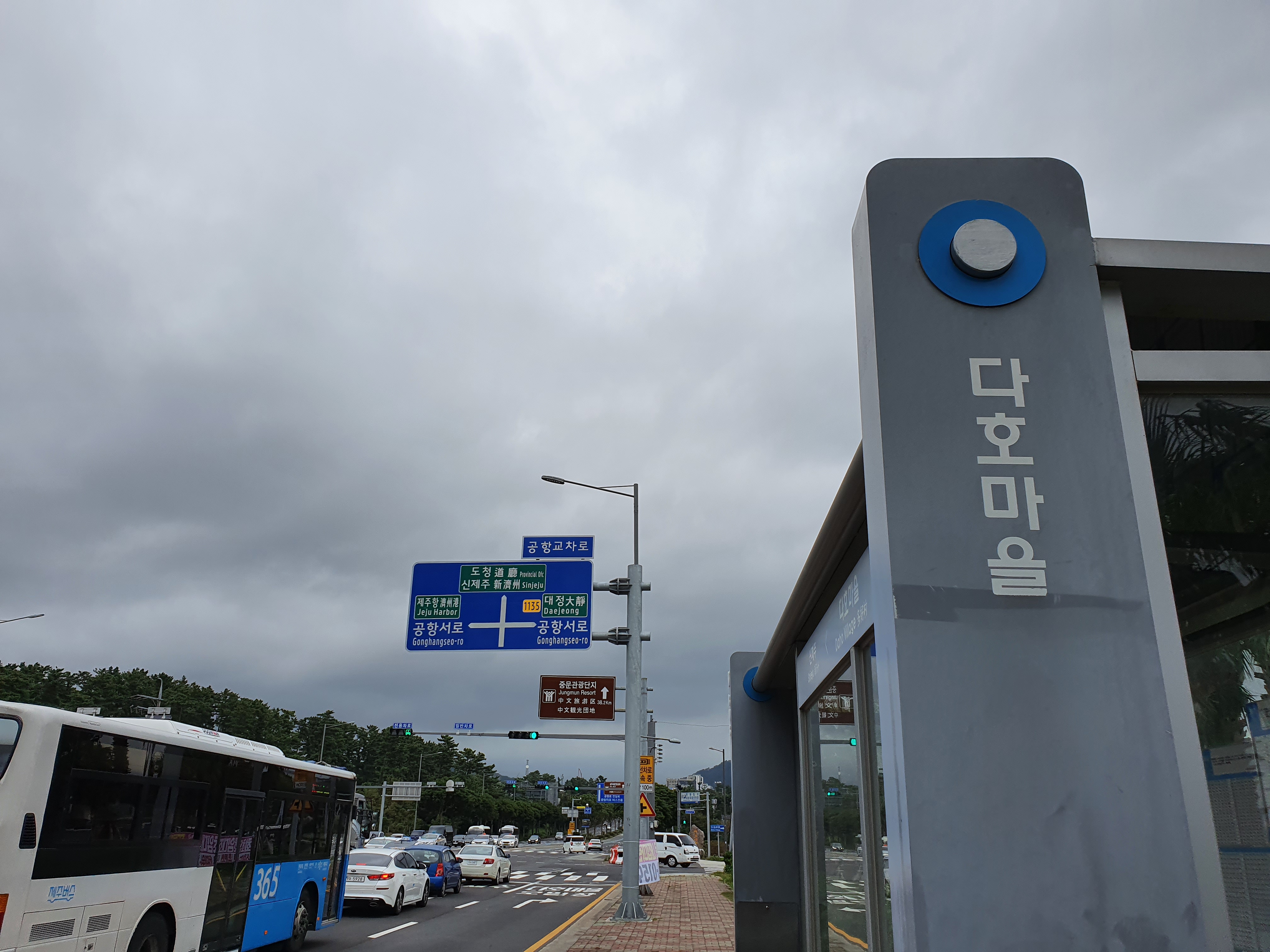 길을 건너지 말고, 공항 주차장을 따라 오른쪽으로 커브를 돌면 버스 정류장이 나오는데, 이 곳이 다호(多好) 마을 정류소입니다. 제주시내로 가는 버스들이 정차하는 곳이죠.