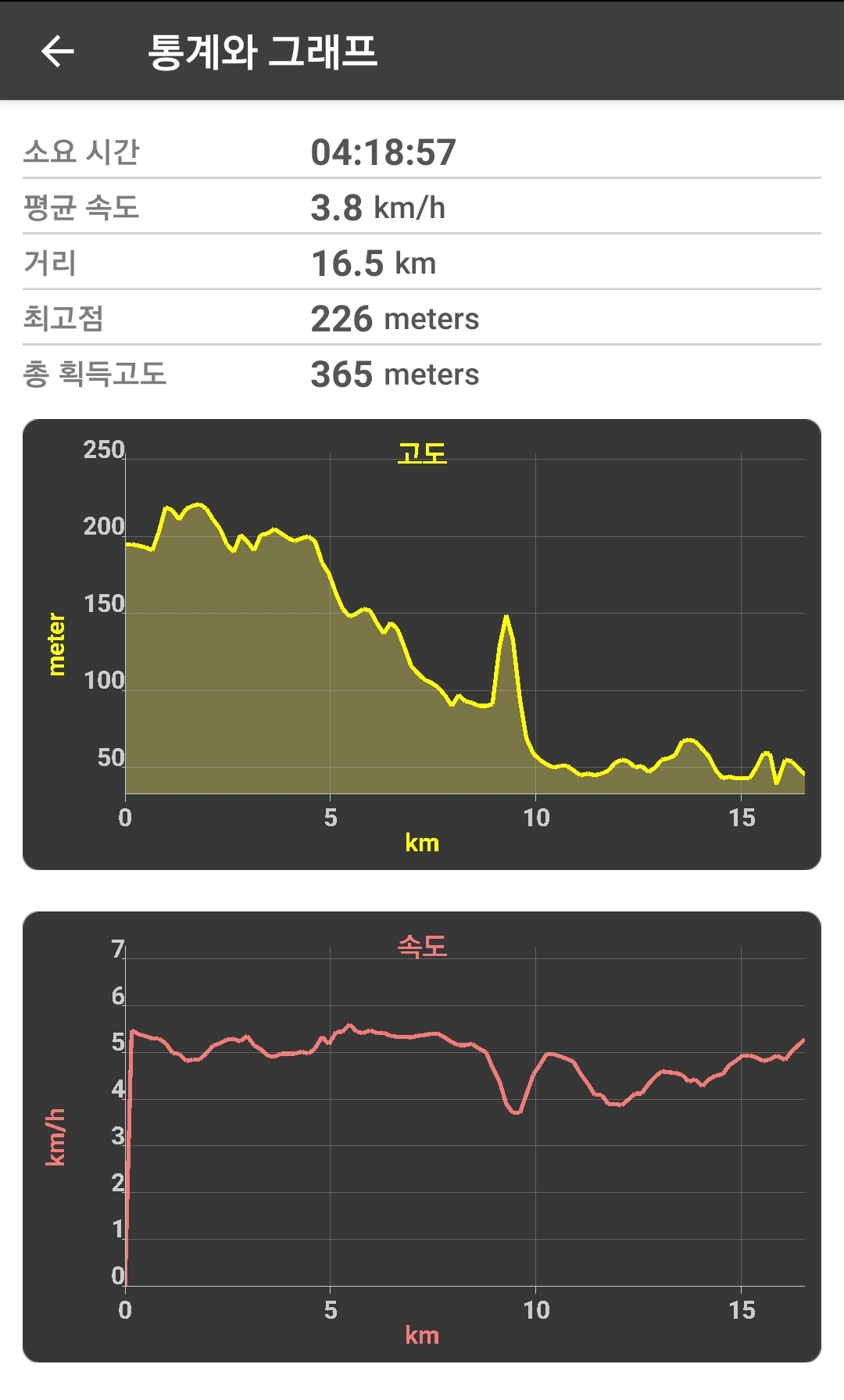 총 길이는 15.8km 정도이며, 역방향으로 이동하니 경사가 아랫쪽으로 깔리므로 더욱 편안해서, 쉬엄쉬엄 걸어도 4시간 남짓 소요되었네요.