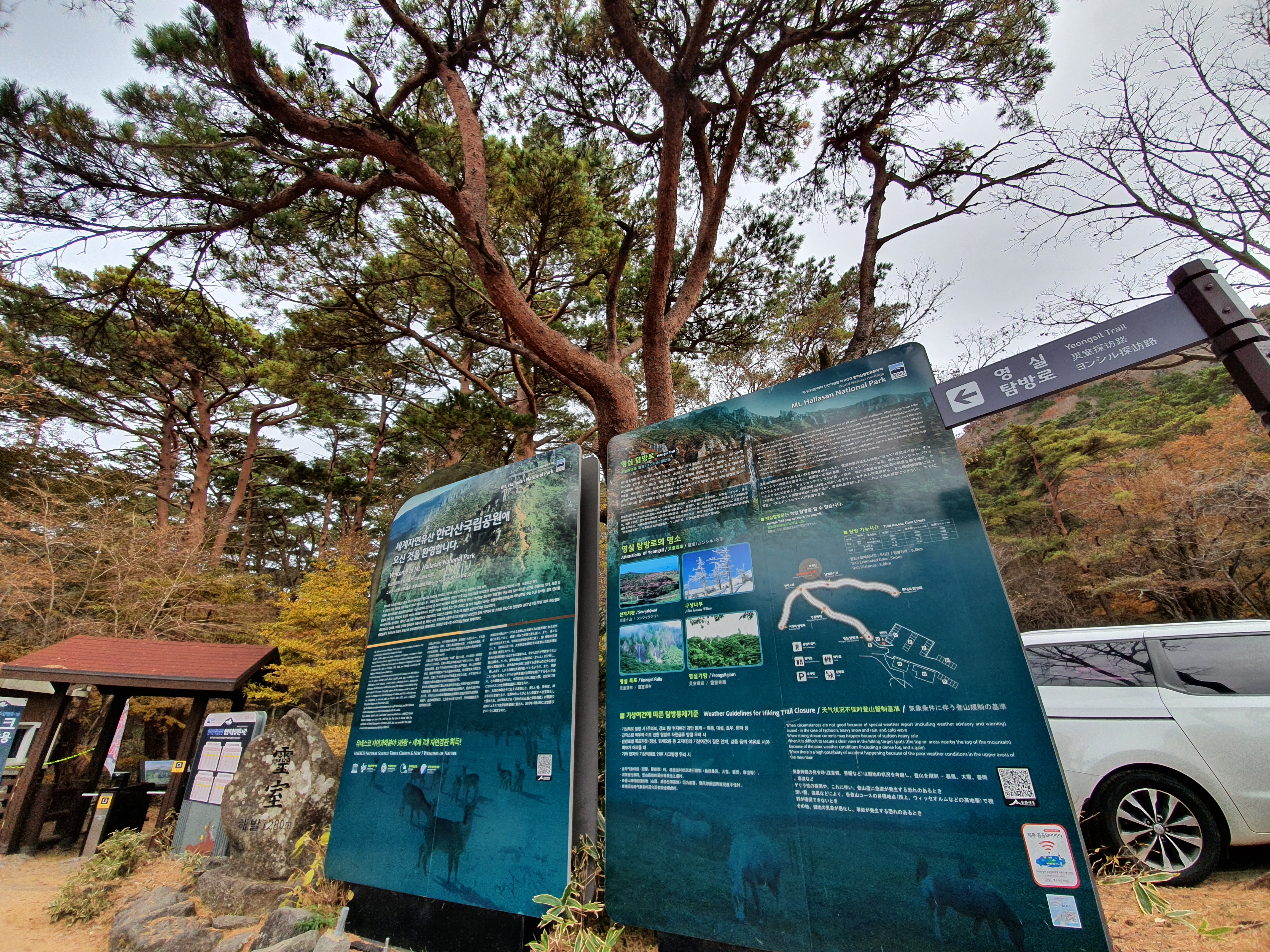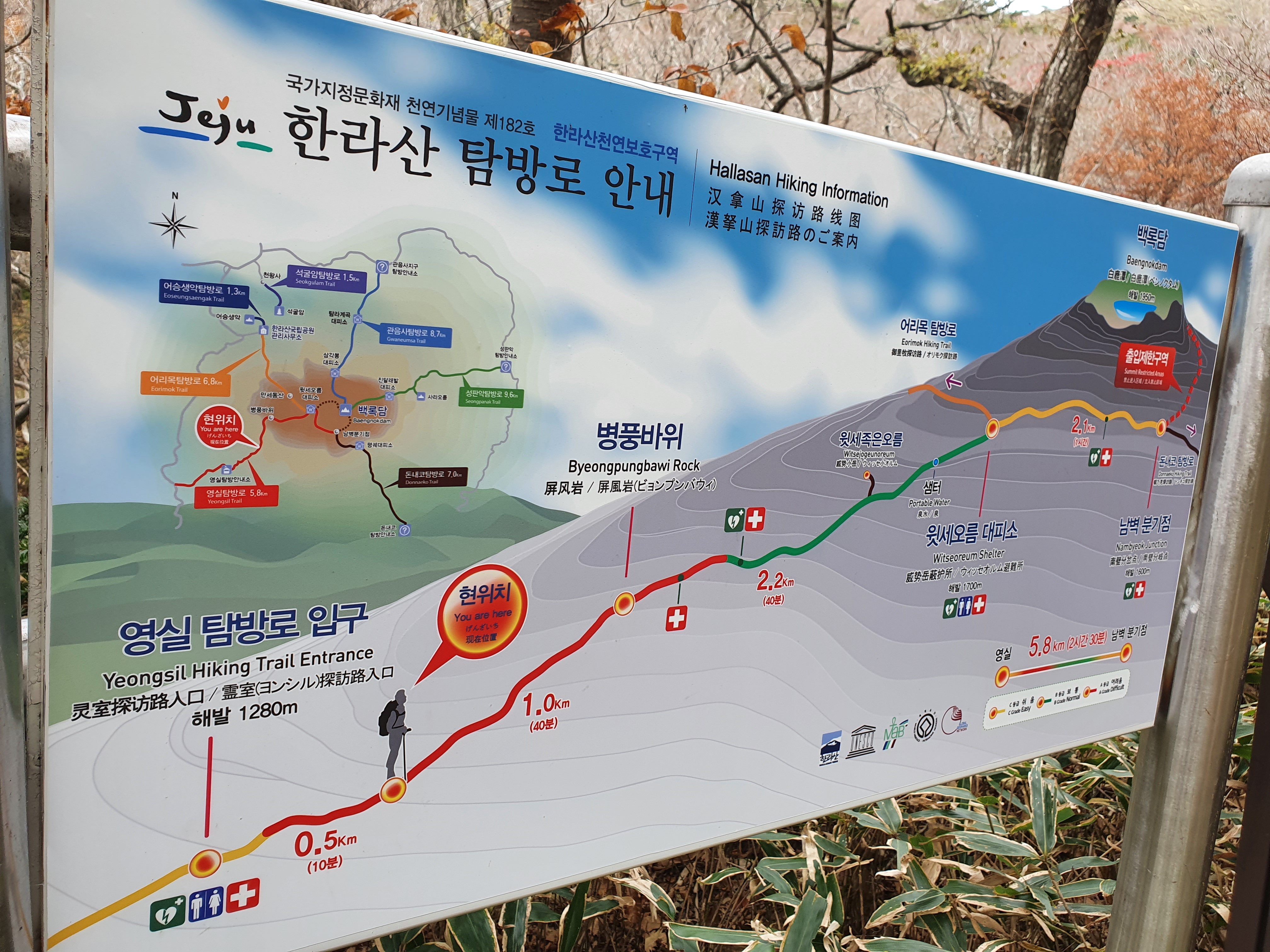 영실탐방로 입구에 도착했습니다. 출발전 화장실을 한번 다녀오고, 안내문들을 건성건성으로 한번 읽어봅니다 (노안이라 잘 안보여요;;;)