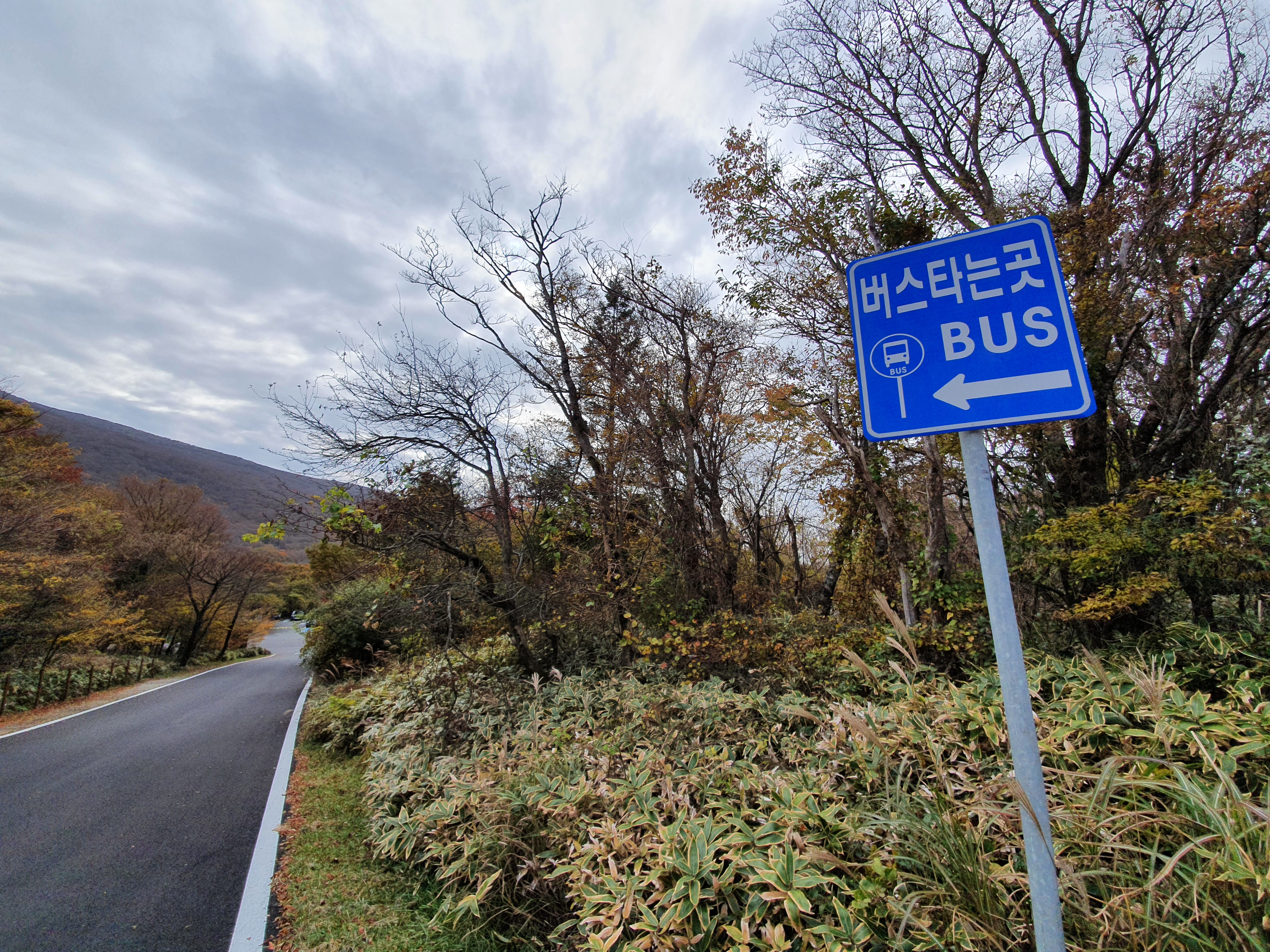 버스는 탐방로 입구에서 타는 것이 아니라, 아랫쪽 버스정류장까지 약 1km를 걸어 내려가야 합니다.