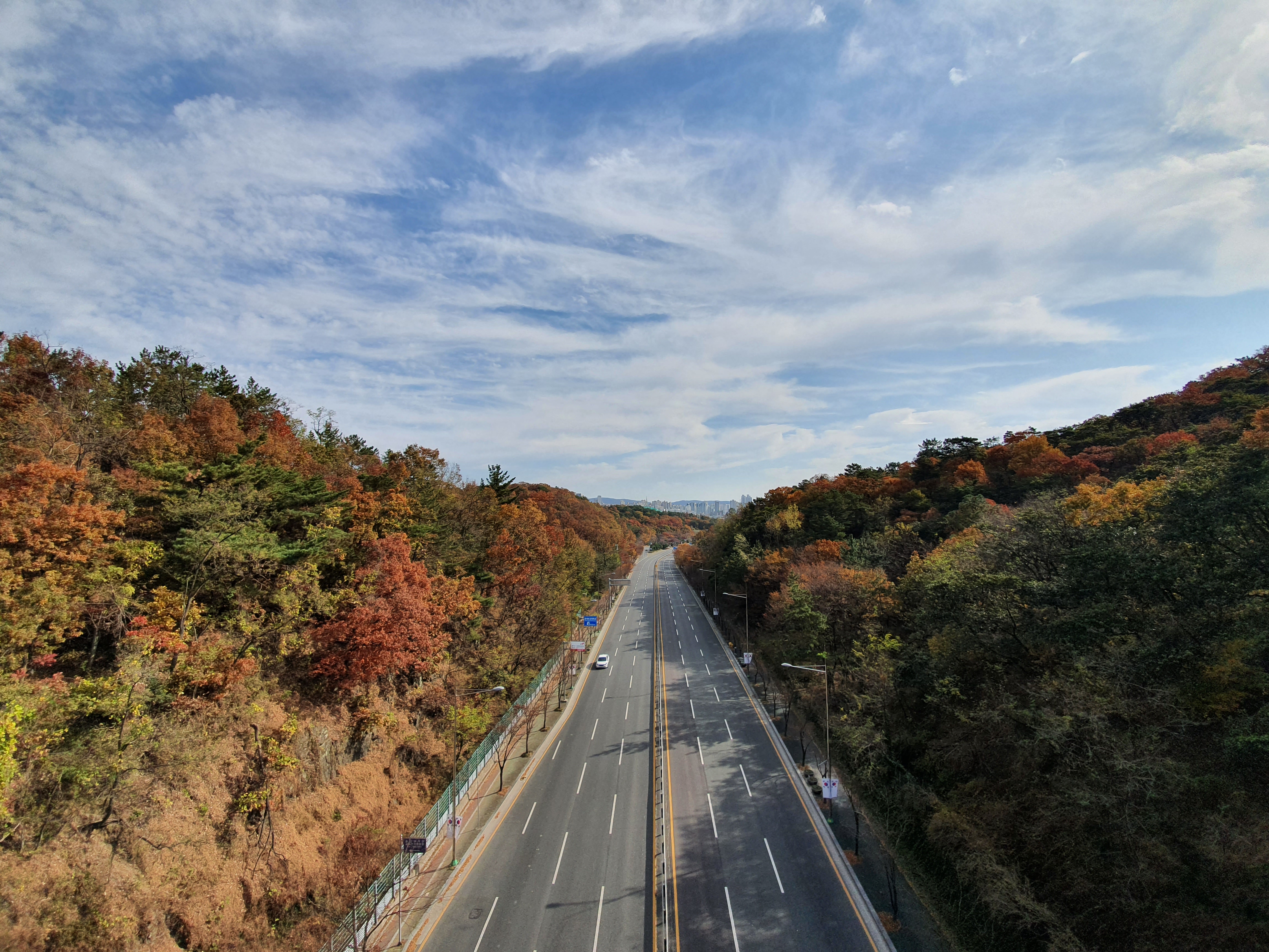 푸르른 하늘과 흰 구름 아래 완만한 산길이 좌측, 우측으로 휘어나가며 이어집니다.