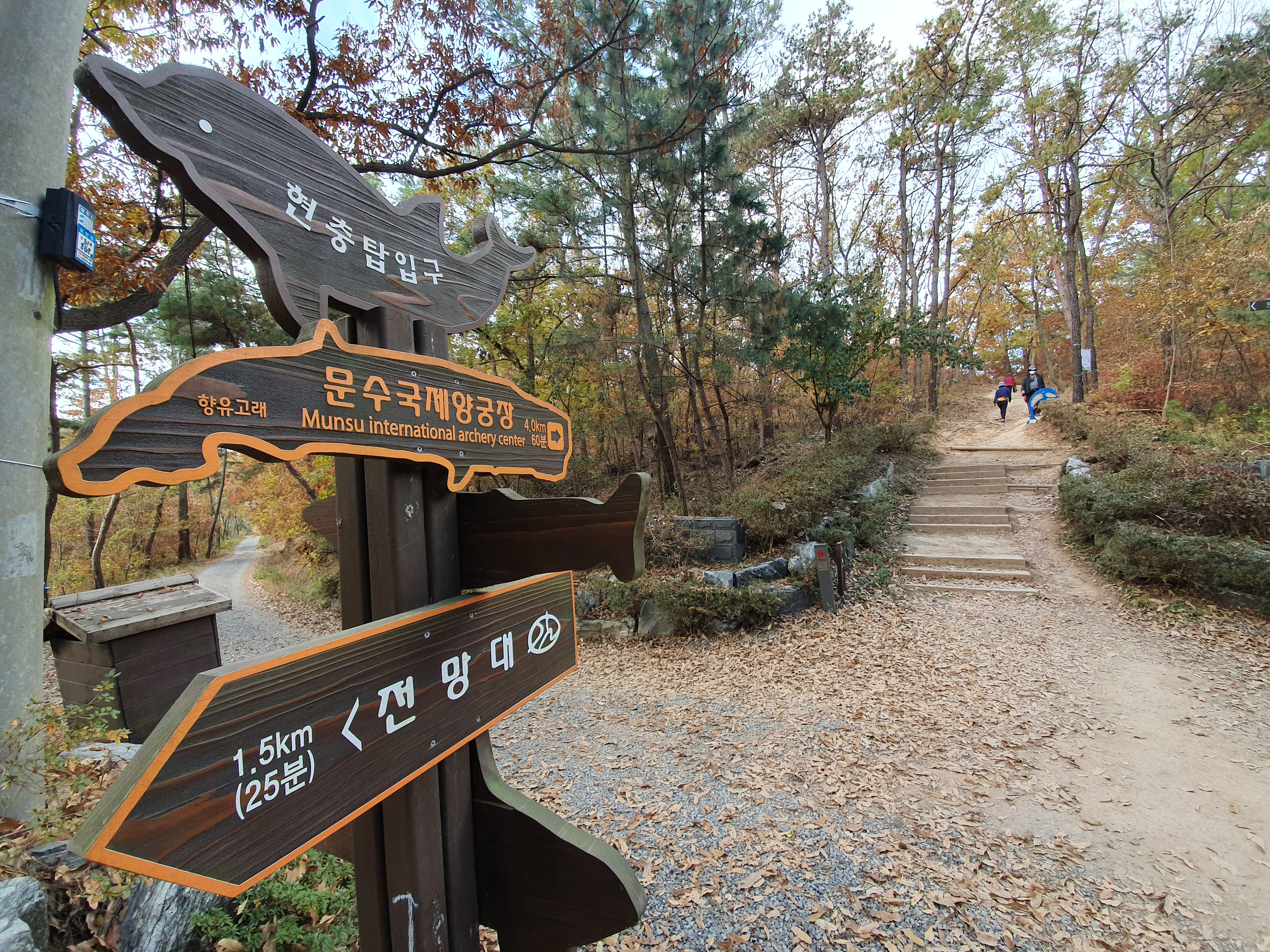 울산대공원 정문/남문 도로를 위로 가로질러 "솔마루길 종합 안내판" 옆에 있는 넓은 등로를 따라 오릅니다.