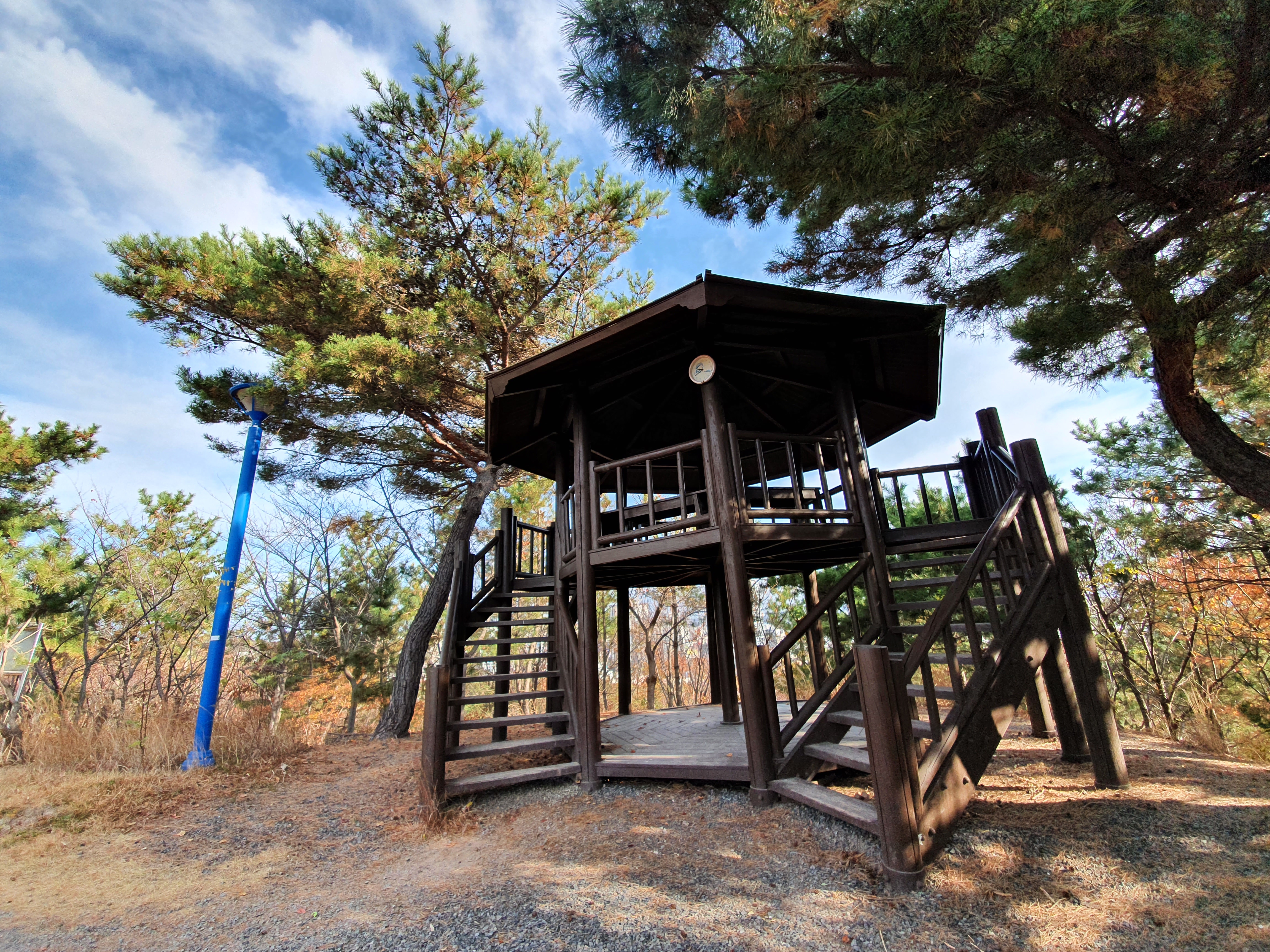 진행방향 우측의 2층 정자에 올라서 잠시 쉬어갑니다. 여기로 올라간다고 전망이 더 좋아지는 것은 아니에요. 좌측의 전망데크에 햇살이 따뜻하니 그 곳에서 쉬어도 좋습니다.