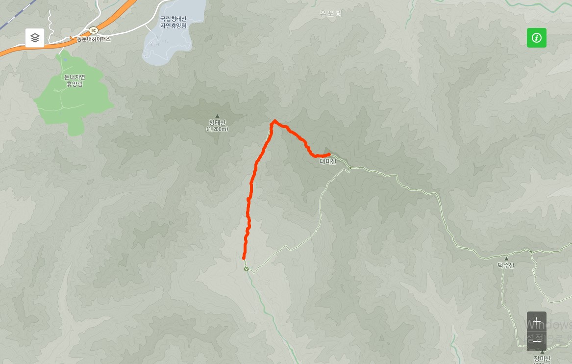 * 대미동 - (2.58km)창재 - (1.62km)대미산 정상 - (2.0km)움트골 - (2.79km)대미동