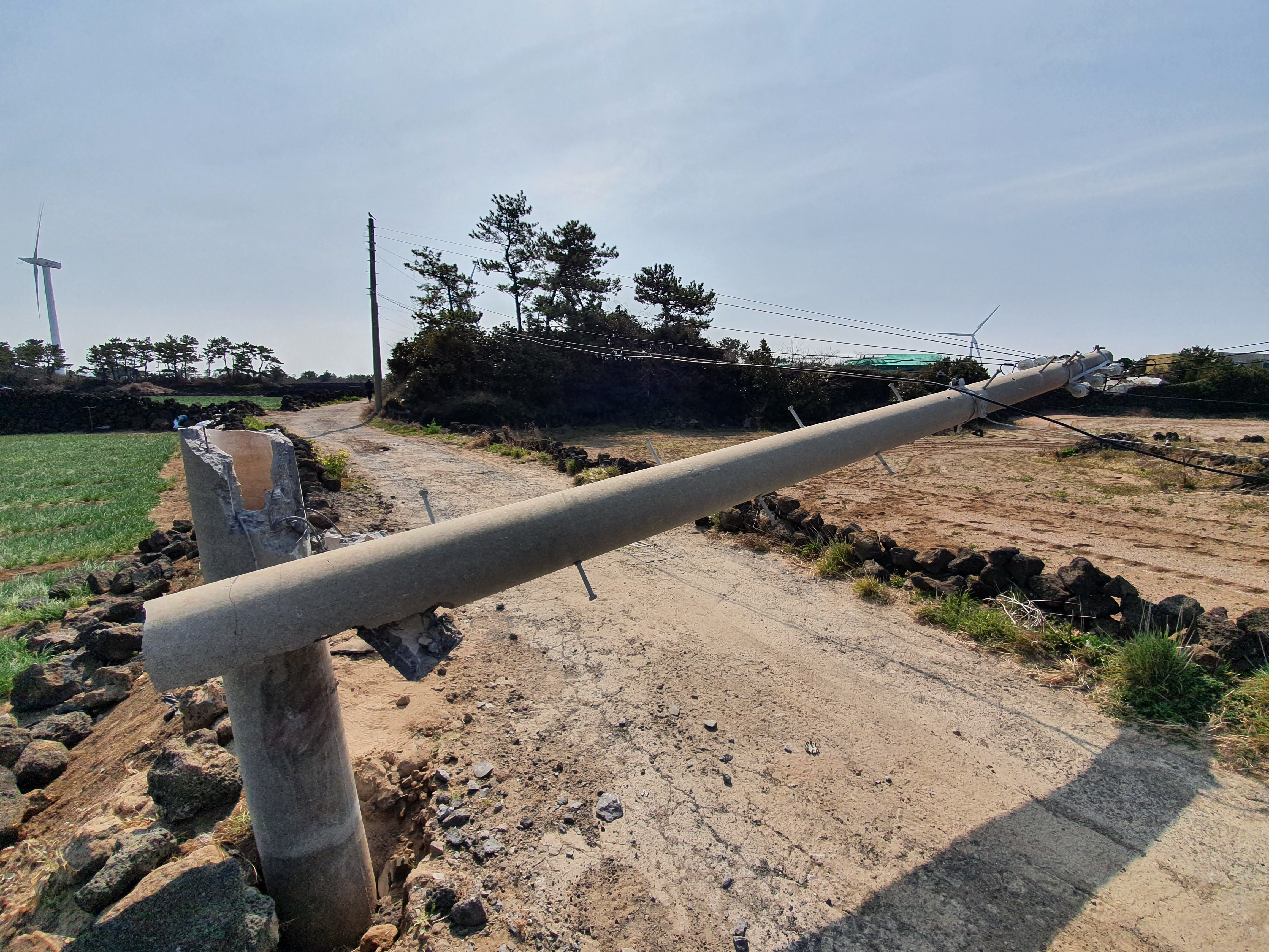 무슨 일이 있었던 것일까요? 전봇대가 부러져 길을 가로막고 있습니다. 하지만, 전선은 끊어지지 않았으니, 지나다닐때 각별히 조심해야 할 것 같네요.
