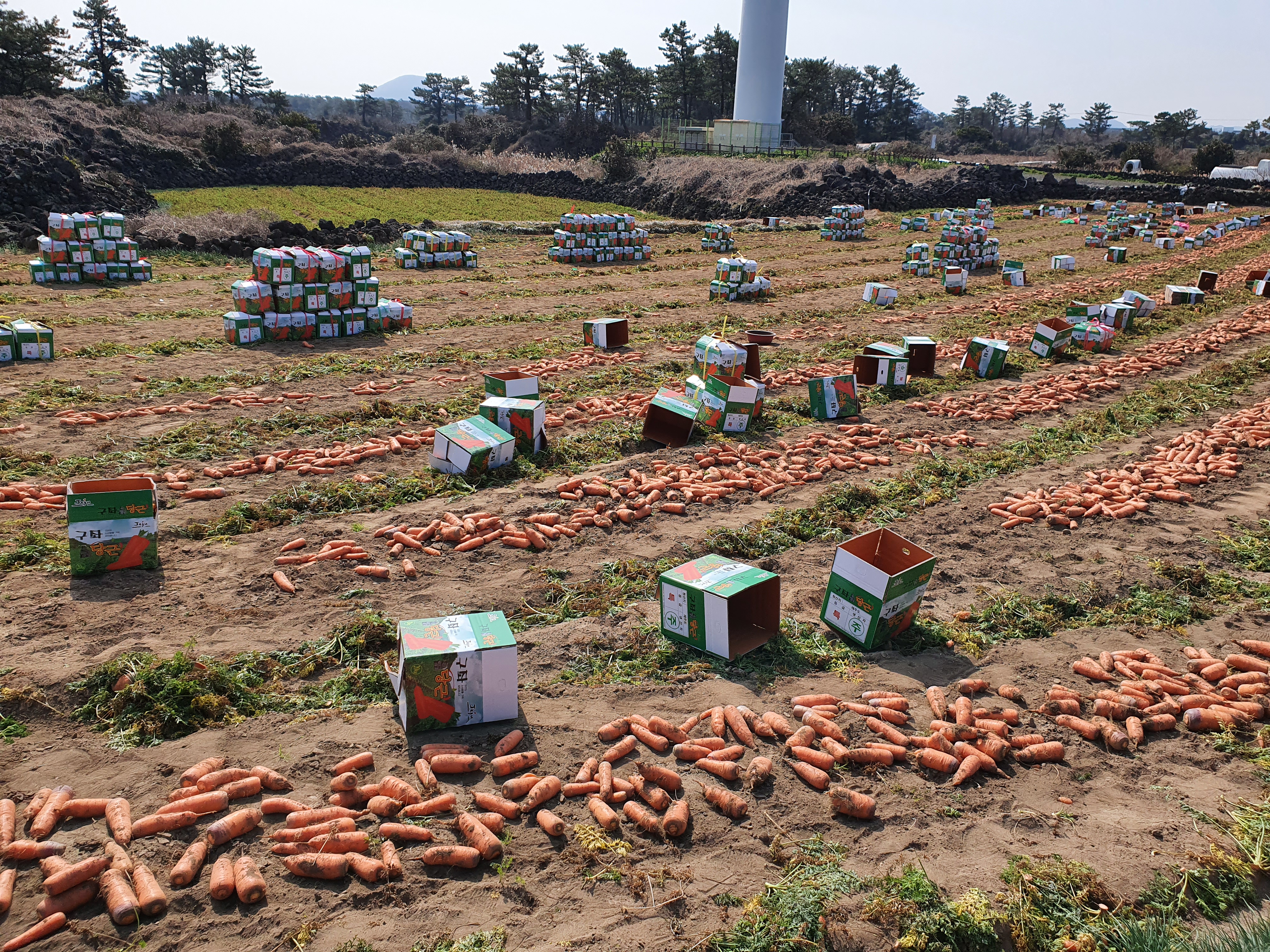 그 유명한 제주 구좌당근입니다. 마을 주민들께서 밭에서 당근을 수확하여 박스에 담고 계시는군요.