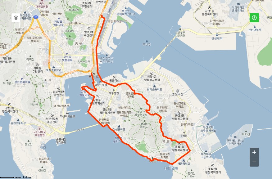 * 부산역 - 봉래산 편백림 - 중리초등학교 – KT동삼빌딩 - 중리바닷가 – 흰여울문화마을 - 깡깡이 예술마을 - 영도대교 입구