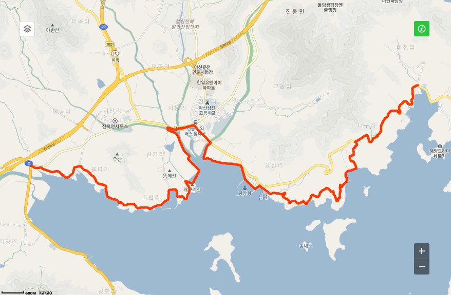 - 시작지점 : 마산합포구 구서분교 앞 사거리(경남 창원시 마산합포구 구산면 마전리 111-1)