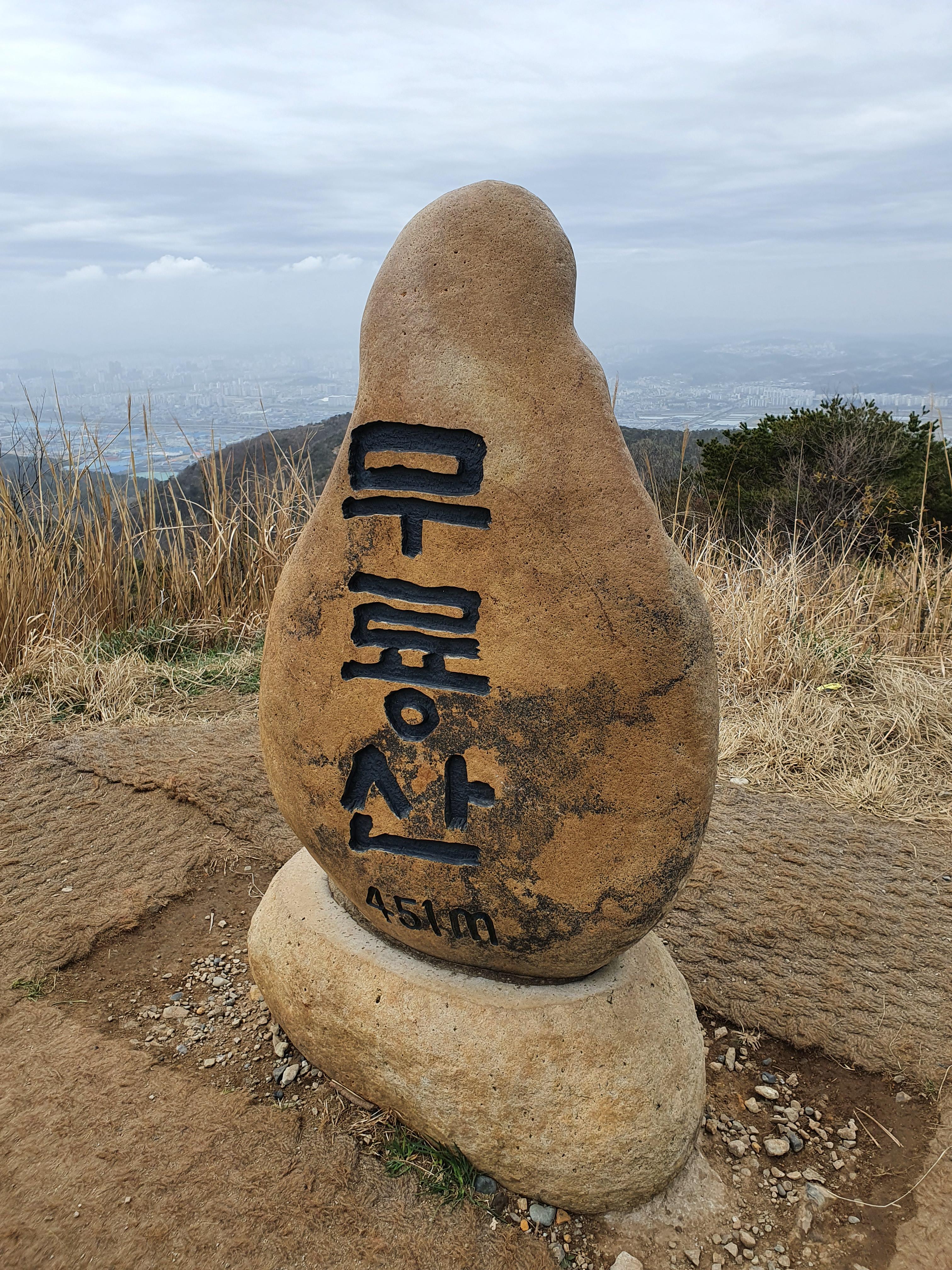 무룡산 정상석 뒷편으로 울산 시내의 모습이 펼쳐져 있습니다. 초입에서는 해가 쨍하고 나었지만, 서서히 날씨가 흐려지고 있네요. 시간을 지체하지 말고 하산해야 할 것 같습니다.