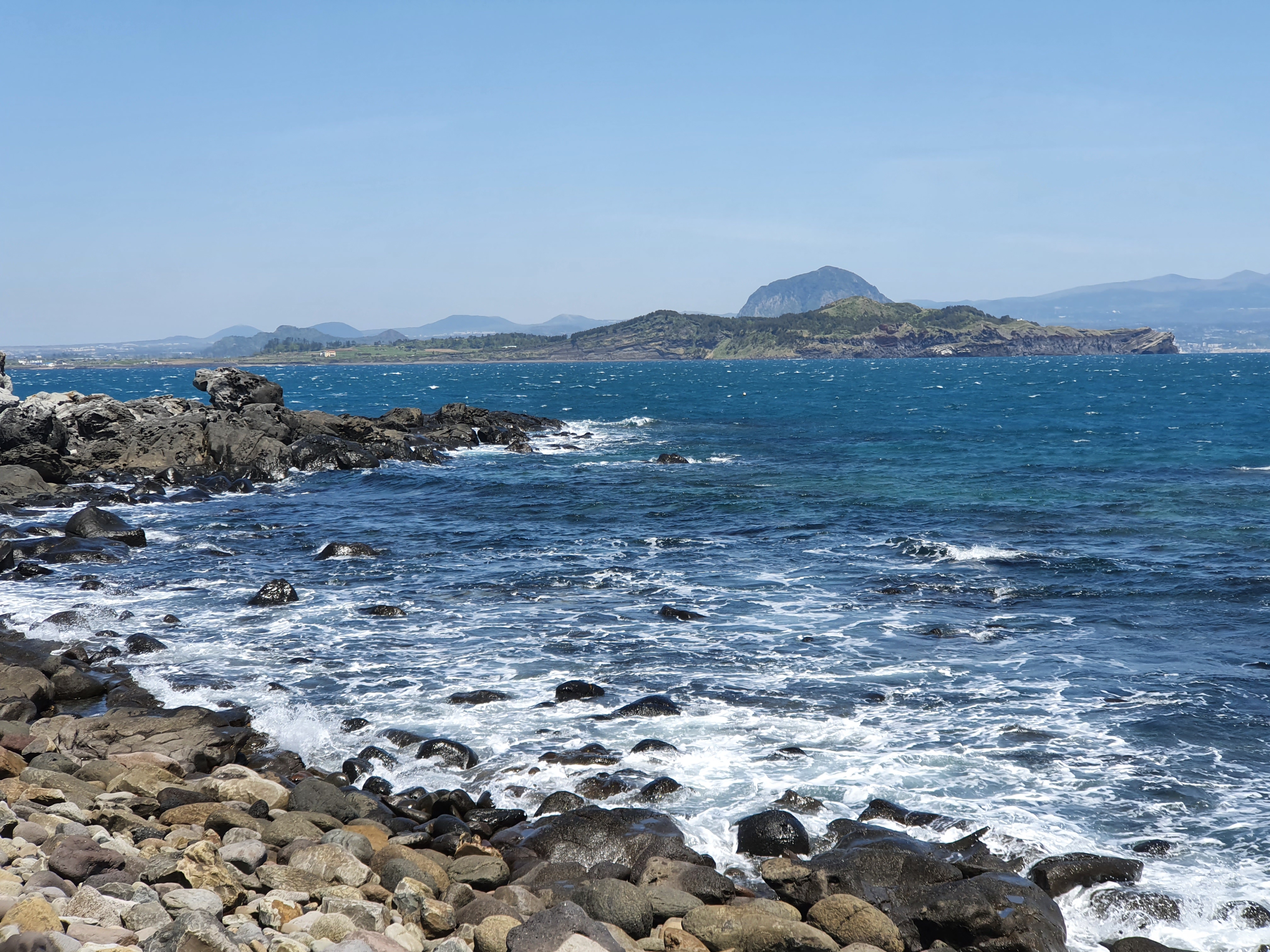 제주 본 섬의 모습도 보입니다. 왼쪽 볼록하게 솟은 곳이 산방산, 오른편 높게 보이는 곳이 한라산이죠. 한라산은 늘 구름에 쌓여 있어서 이렇게 선명하게 보기가 쉽지 않은데, 오늘은 운이 따라 주는 것 같습니다.