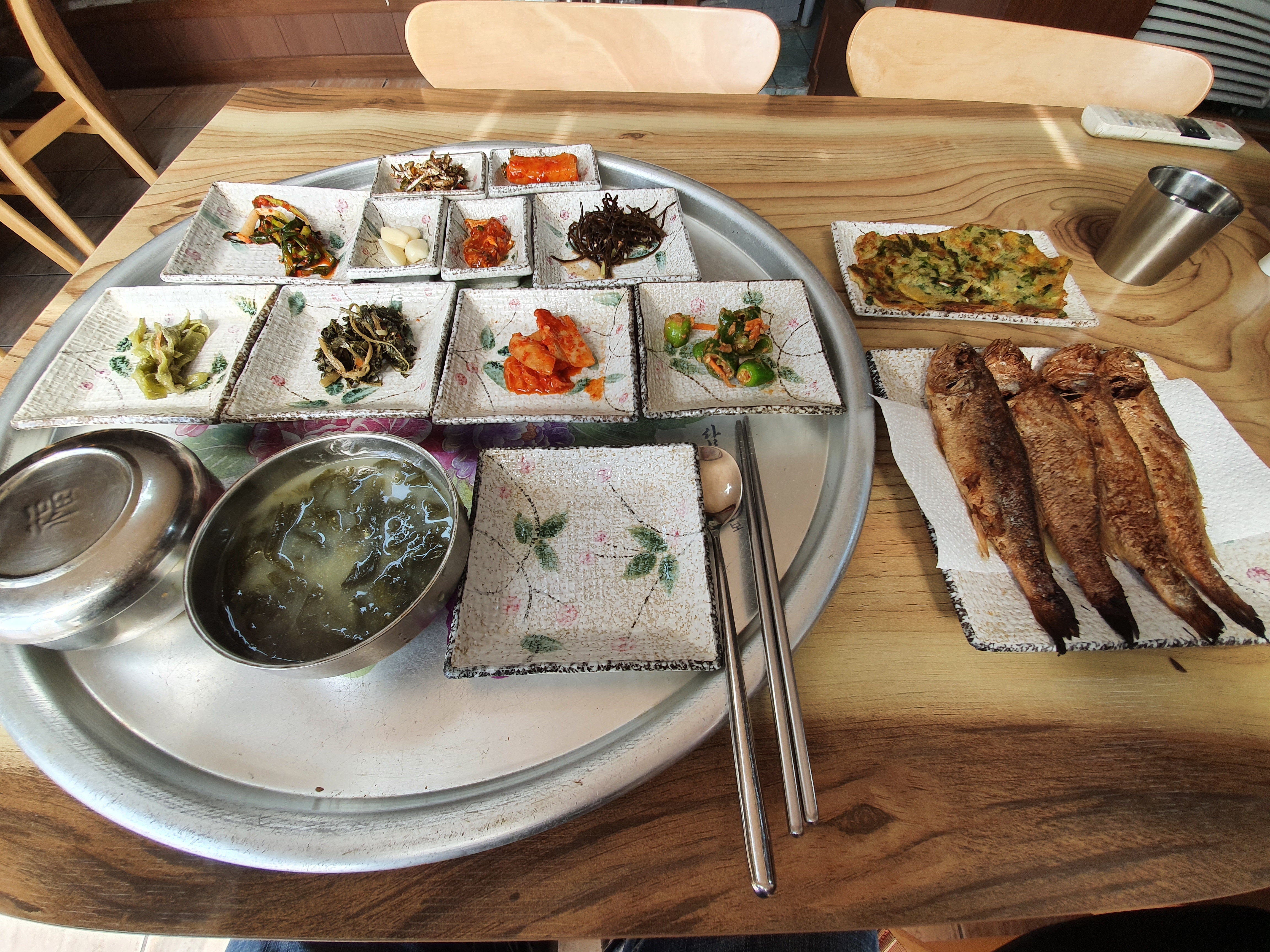 제주항으로 돌아가는 배 시간이 약 50분 정도가 남았으니, 추자도의 명물 굴비정식으로 늦은 점심식사를 합니다. 역시나 1인분씩 파는 곳은 잘 없어서 2인분 주문하고 실컷 잘 먹었습니다. 메인디쉬 조기구이는 물론, 미역국과 젓갈류까지 아주 맛있더라구요.