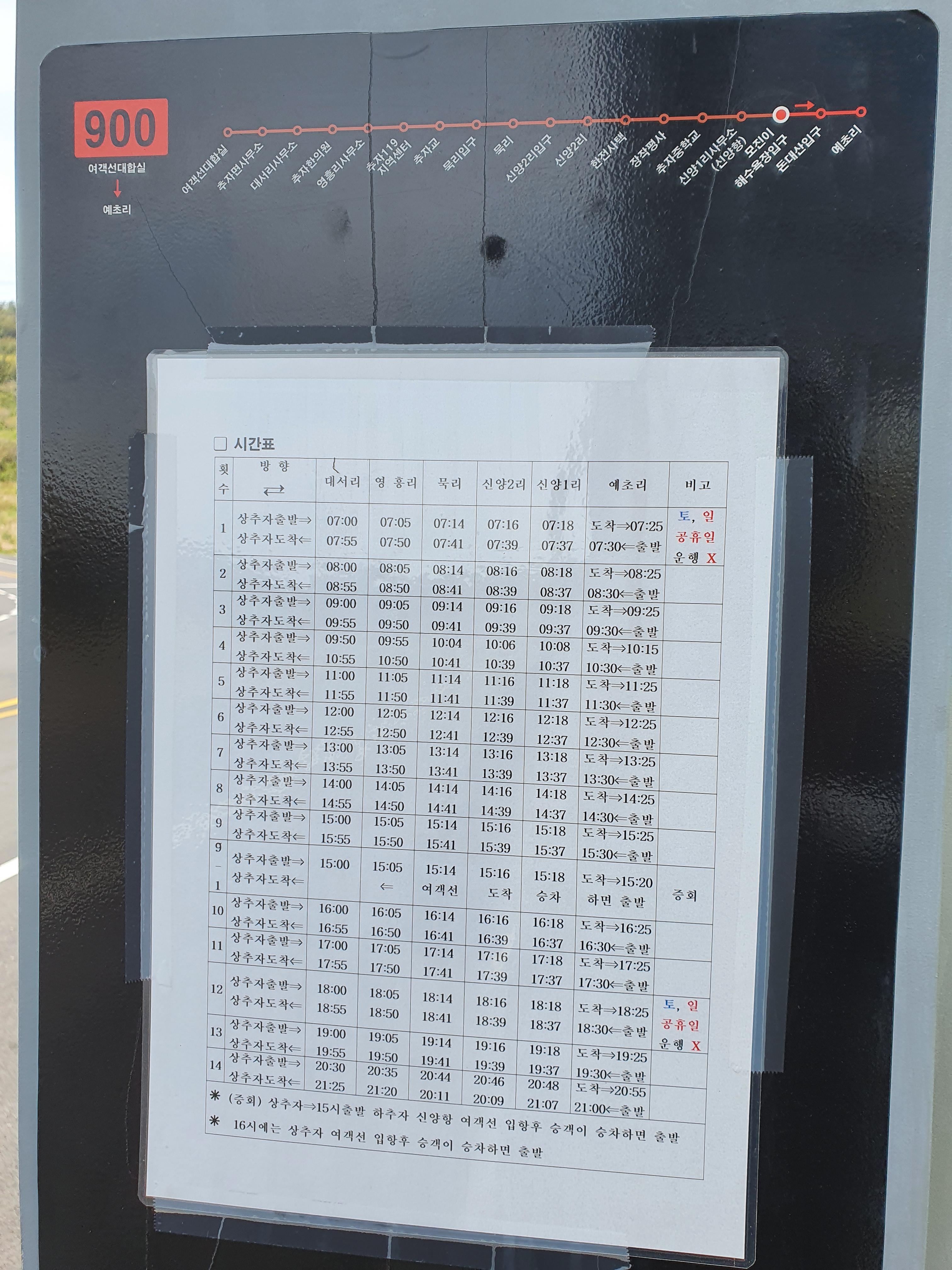 오전 7시부터 오후 8시 30분까지 1시간에 한 대꼴로 운행을 하는 900번 버스. 상추자항에서 출발하여 예초리에 도착하는 순환버스 입니다. 상추자항에서 이용요금 1천원을 내고 하추자에 와서 거꾸로 코스를 가로지르는 방법도 있지요.