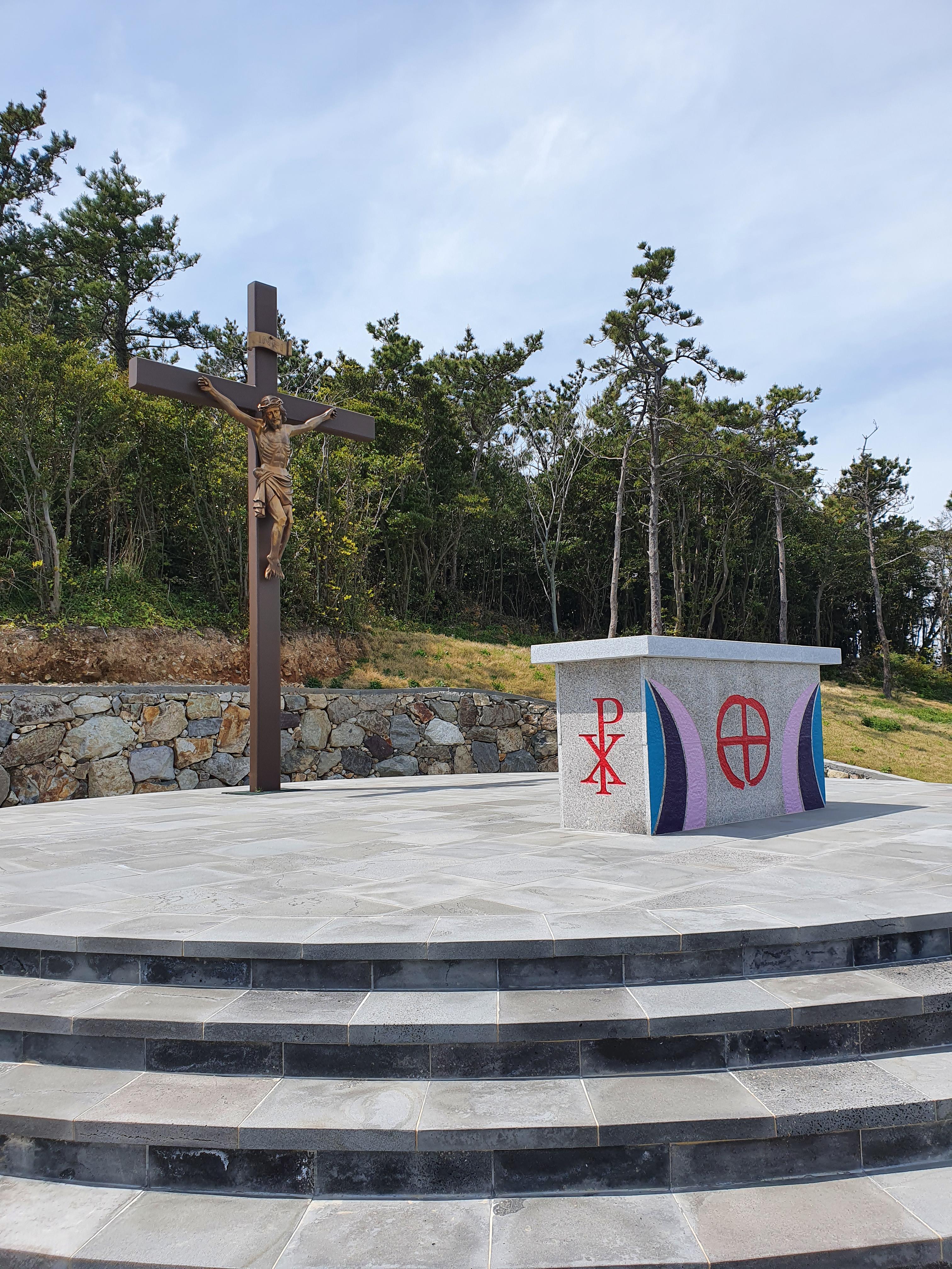 신대산 전망대에서 나무계단을 따라 약 200미터 정도 내려가면 물생이 바위 위에 서 있는 슬픈 역사의 눈물의 십자가를 볼 수 있지만, 멀리서 눈으로만 확인하고 통과합니다.