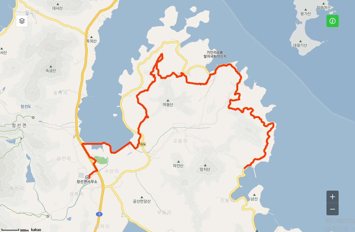 ## 창선면행정복지센터 - 동대만휴게소 - 연곡마을 - 여봉산 정상 - 가인리 고사리밭길 - 공룡발자국화석지 - 세심사 - 가인마을 - 진동리 고사리밭길 - 적량마을