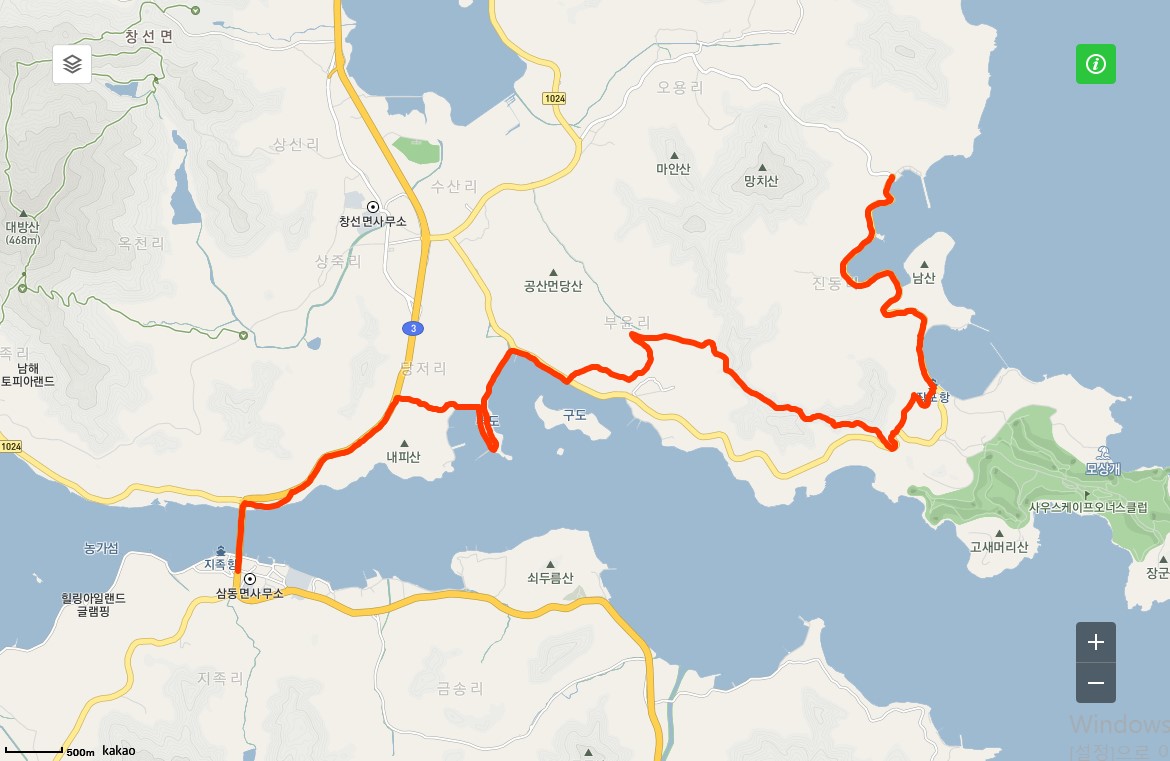 - 시작지점 : 참선면 진동리 적량버스정류장(경남 남해군 창선면 흥선로 1215)