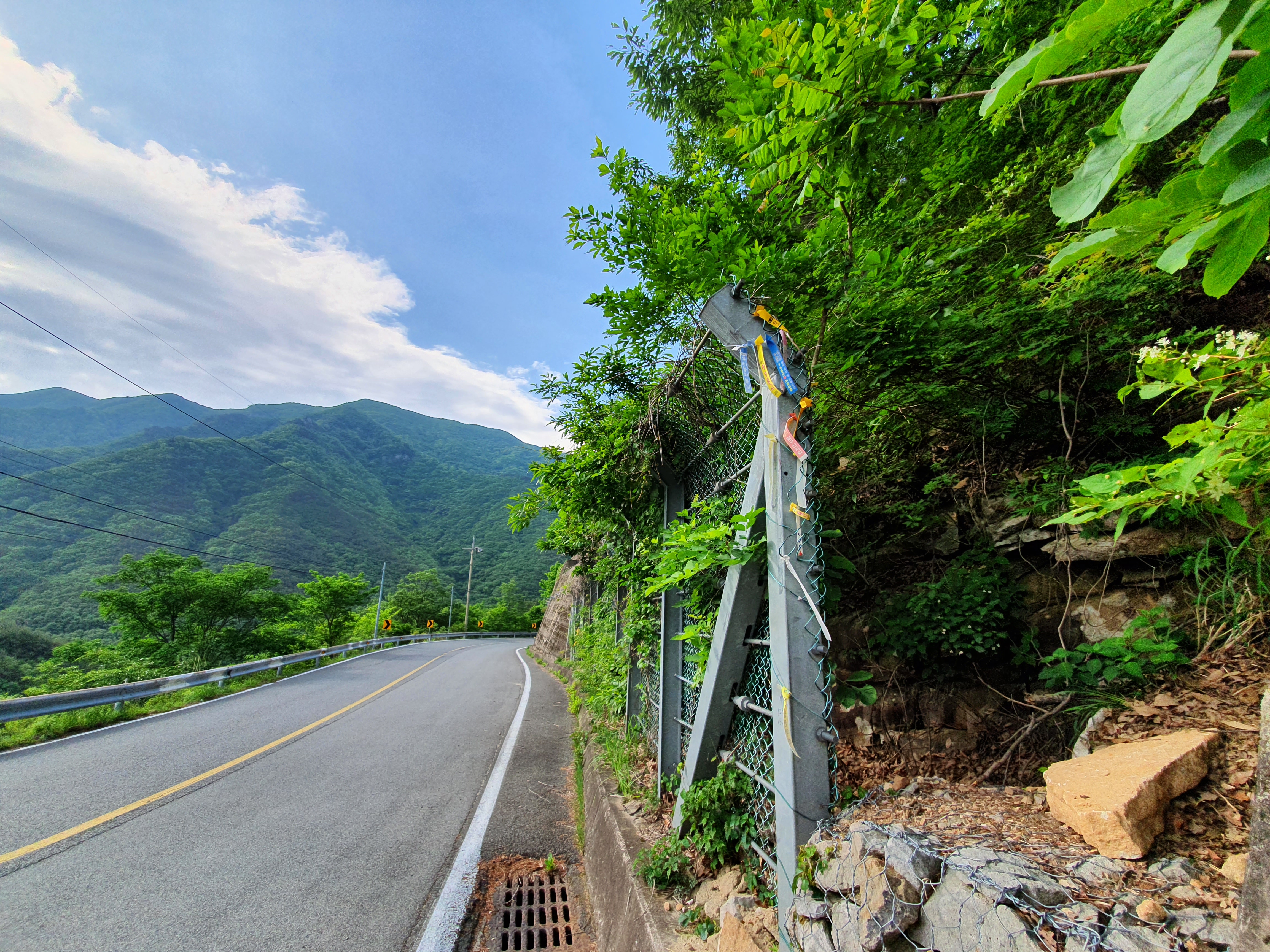 오른편 약간의 내리막 길을 따라 약 500미터 정도 걸어 내려오면 낙석방지망에 산악회 리본이 가득 붙어 있는 출입구가 있습니다. (이 곳을 지나 약 200미터 정도 더 내려가면 또 다른 출입구가 있지만, 결국 위에서 다시 만나게 되므로 어디로 진입하든 무방합니다)