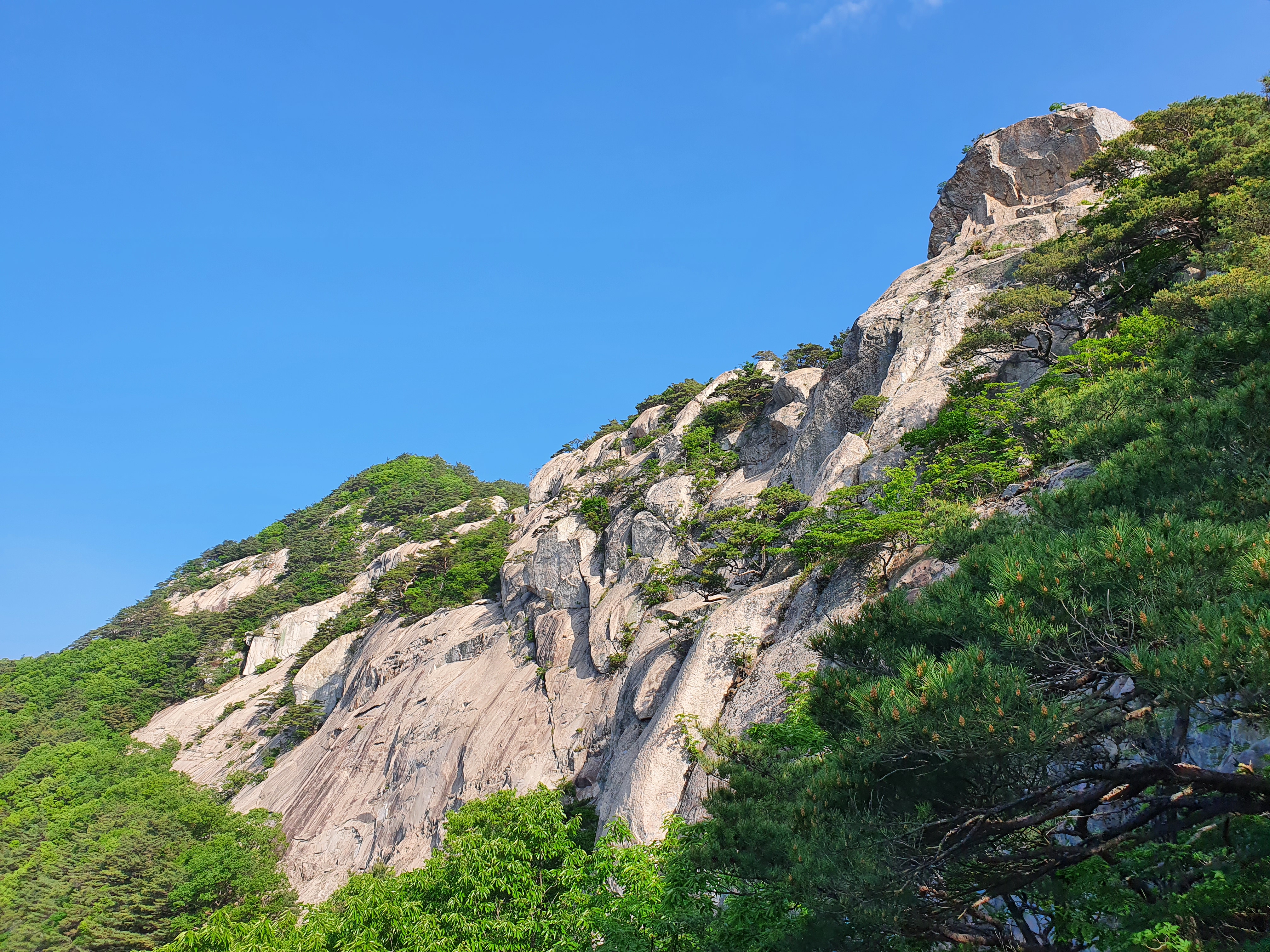 산이 푸르름을 더해간다는 것이 실감이 되네요. 오래된 노송들 사이로 얼음골의 모습을 엿 볼수 있는데, 암릉 끝에는 안전장치가 없으므로 안전사고에 항상 조심해야 합니다.