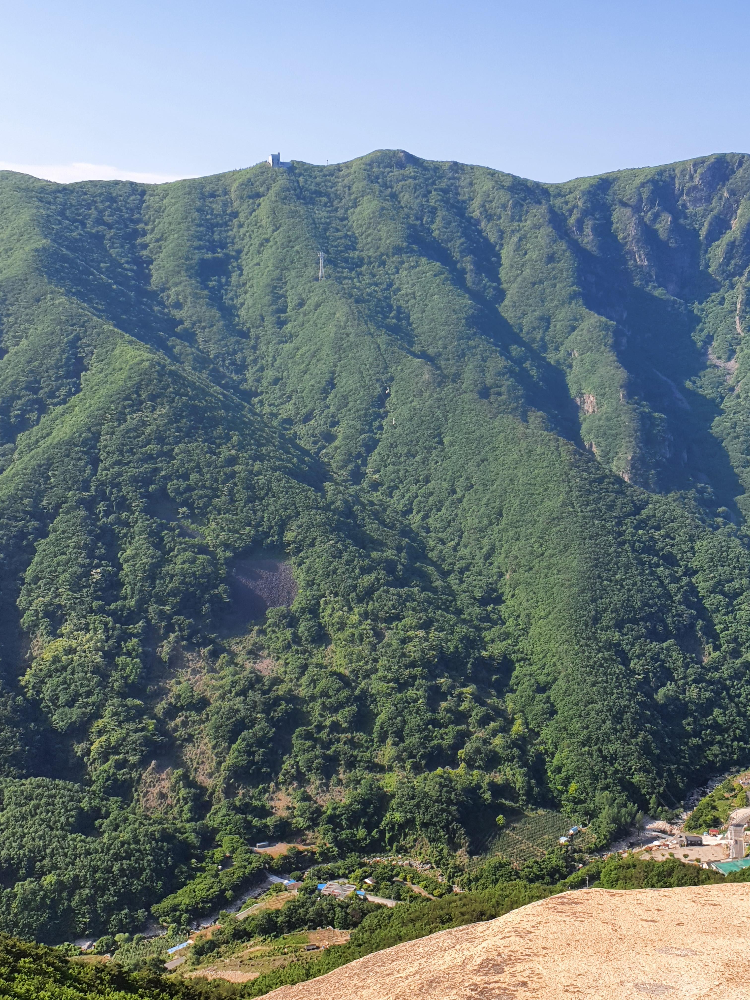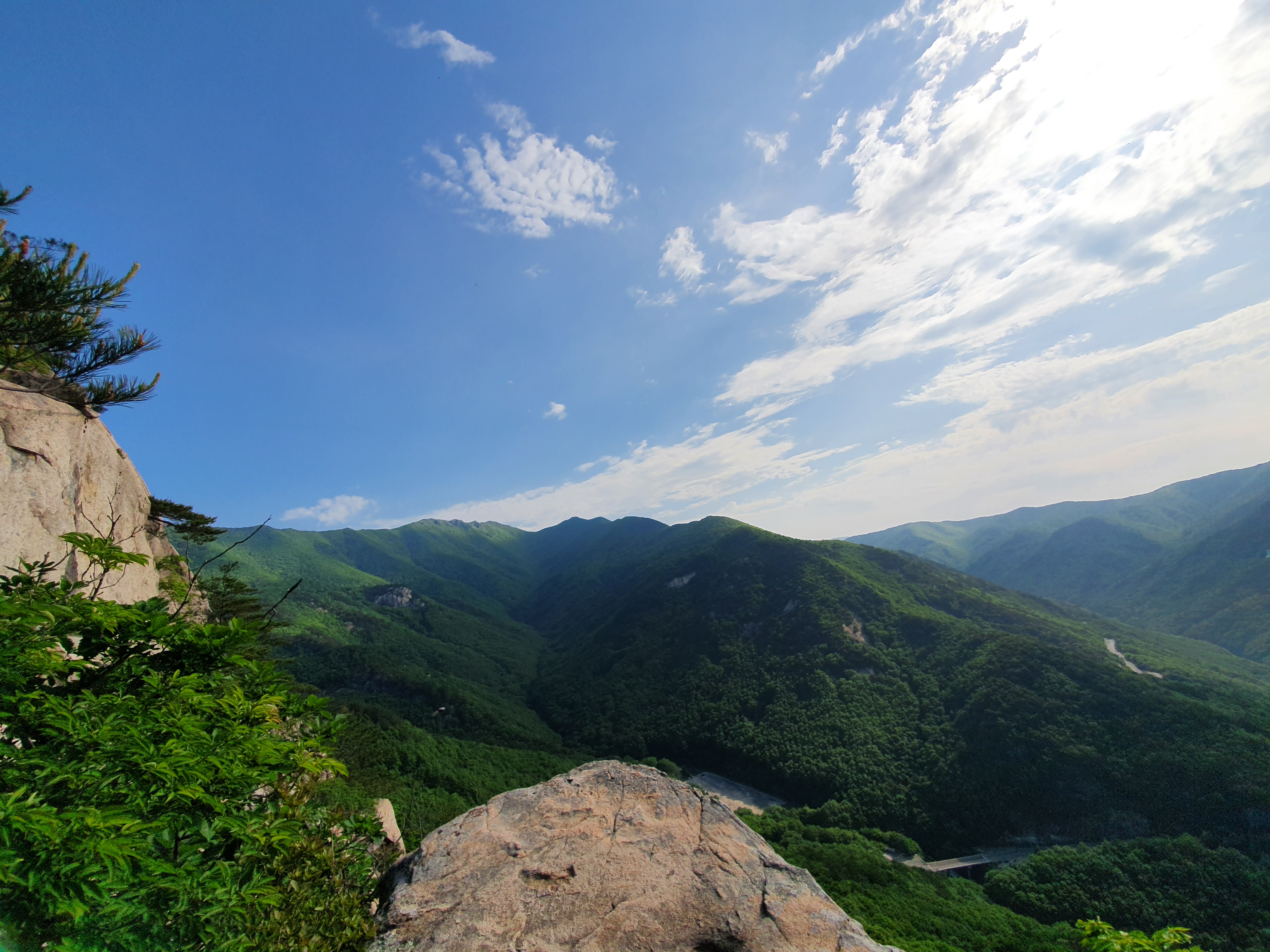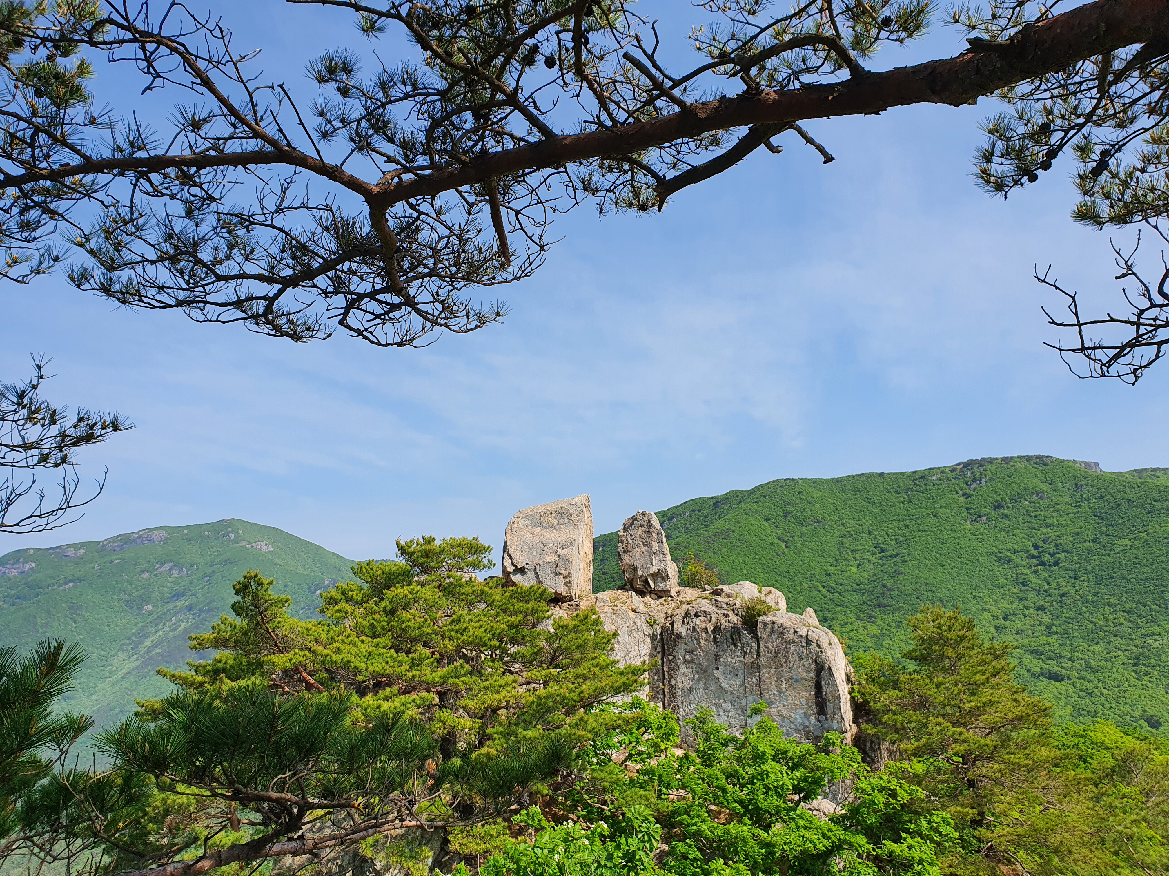 아래로 떨어질 듯 위태롭게 자리잡고 있는 바위 뒷편으로 가지산 정상을 확인할 수 있습니다. 저기에 백패킹 장비를 매고 가서 1박을 했던게 엊그제 같은데, 그 뒤로도 시간이 뙈나 흐른 것 같네요.