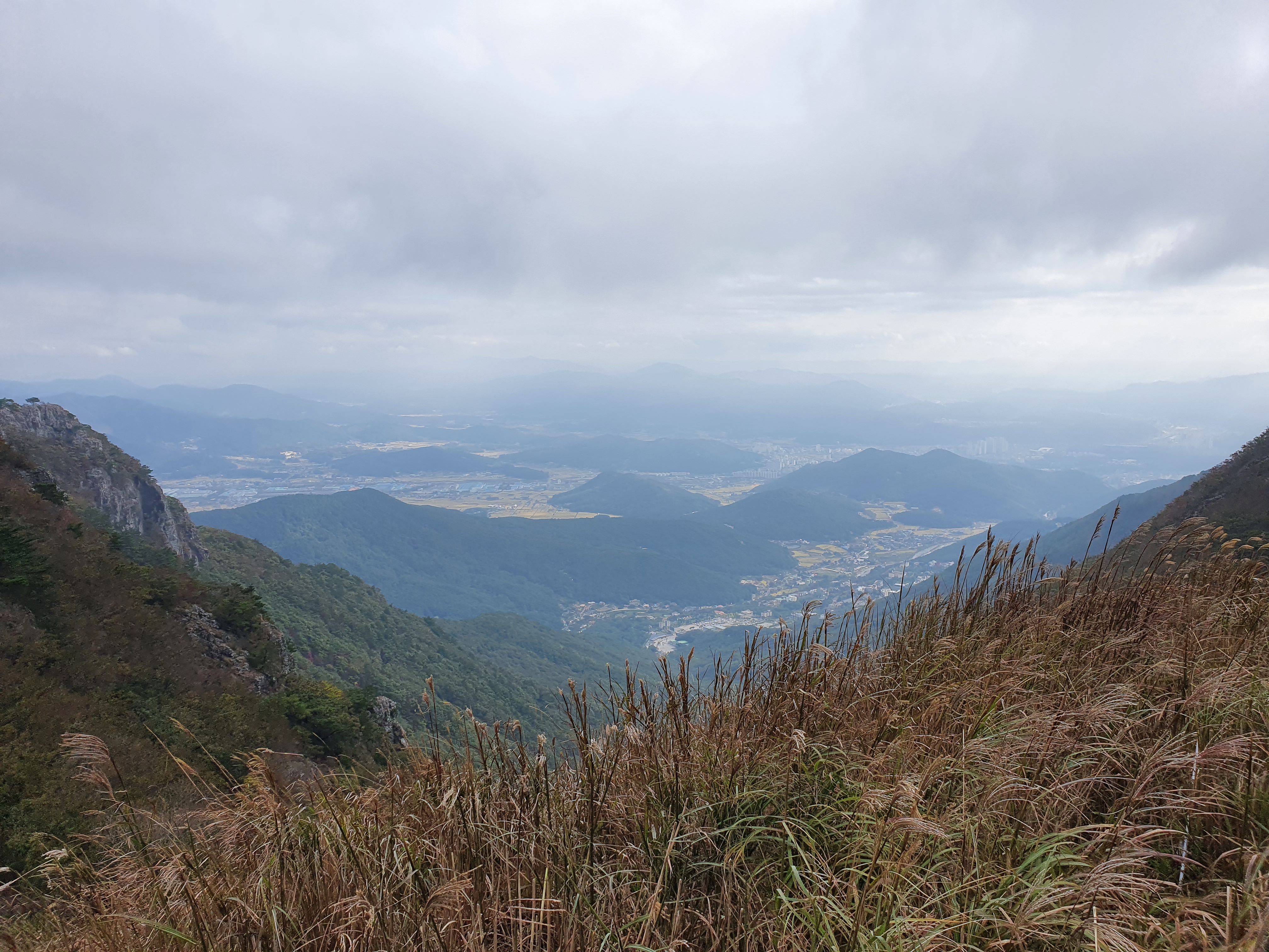 오른편 저 멀리에 정상부가 구름에 덮힌 천황산 사자봉이 보이네요.