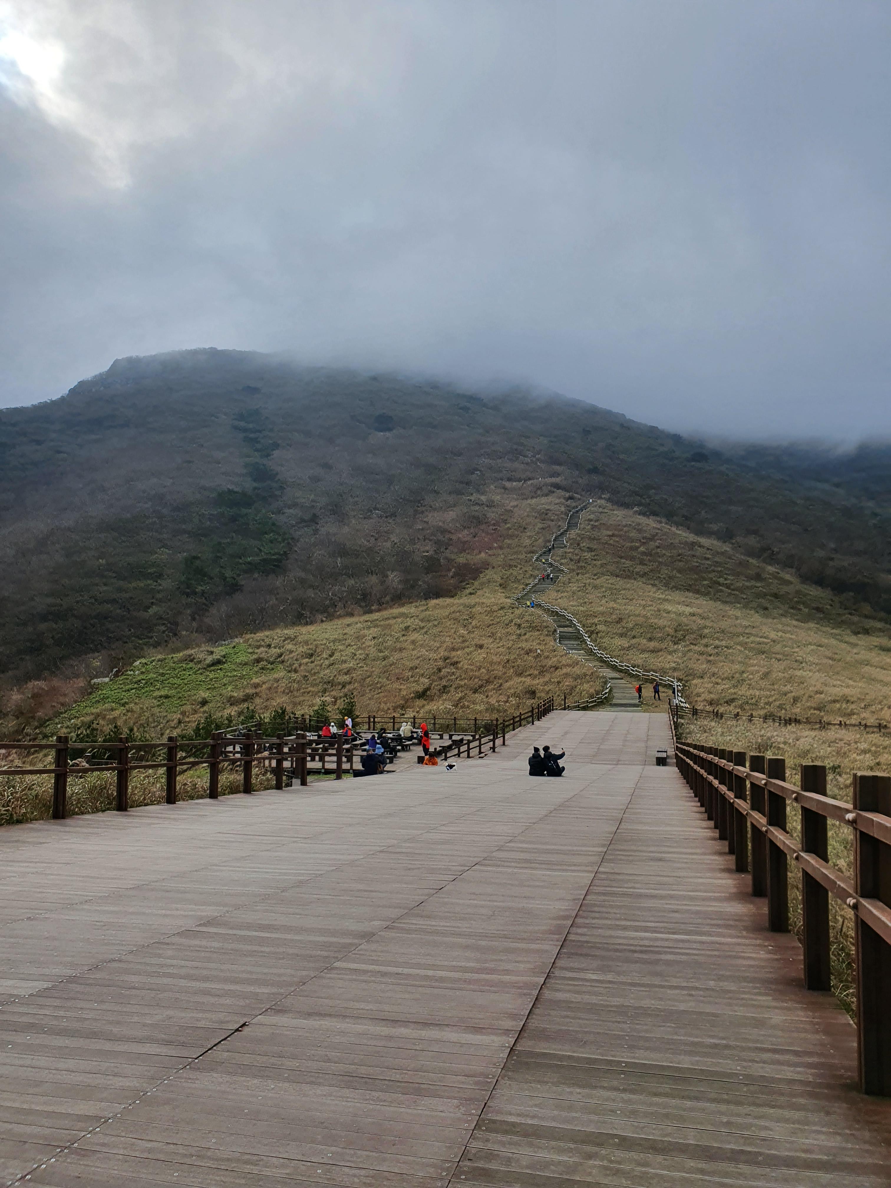 드디어 앞 쪽에 첫번째 목적지인 간월재가 보이기 시작합니다. 오른쪽 신불산 정상은 여전히 짙은 구름에 쌓여 있네요.