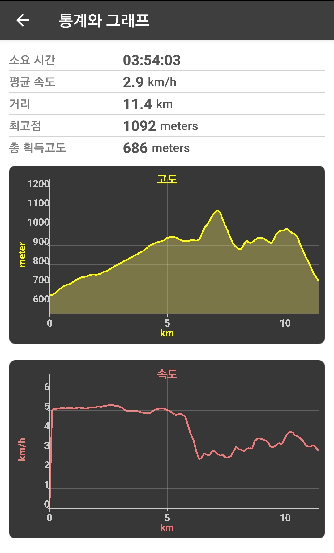이 코스의 이동거리는 11.4km이며, 약 4시간이 소요되었습니다.