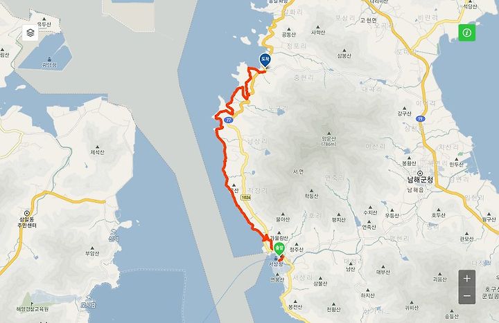 * 남해 스포츠파크(서상) - 예계 - 상남 - 작장 - 남상 - 염해 - 유포체험마을 - 노구 - 중현하나로마트